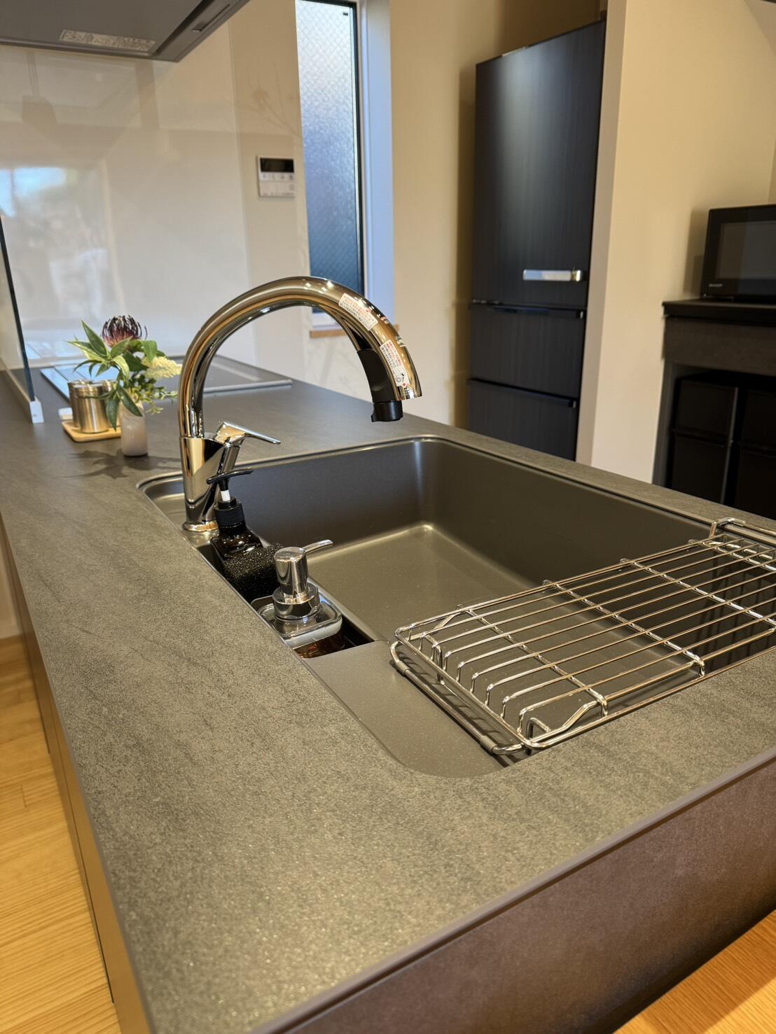 キッチンはLIXILの「リシェルSI」で、セラミックトップを使用しています。熱や傷に強く、お手入れもしやすいので、毎日使う場所だからこそ嬉しい設備だと感じました。シンクにはハイブリッドクォーツシンクが採用されており、汚れが付きにくくお掃除が簡単なのも魅力的です。「キッチンは少しコンパクト」と案内されましたが、収納も十分で使いやすそうな印象でした。