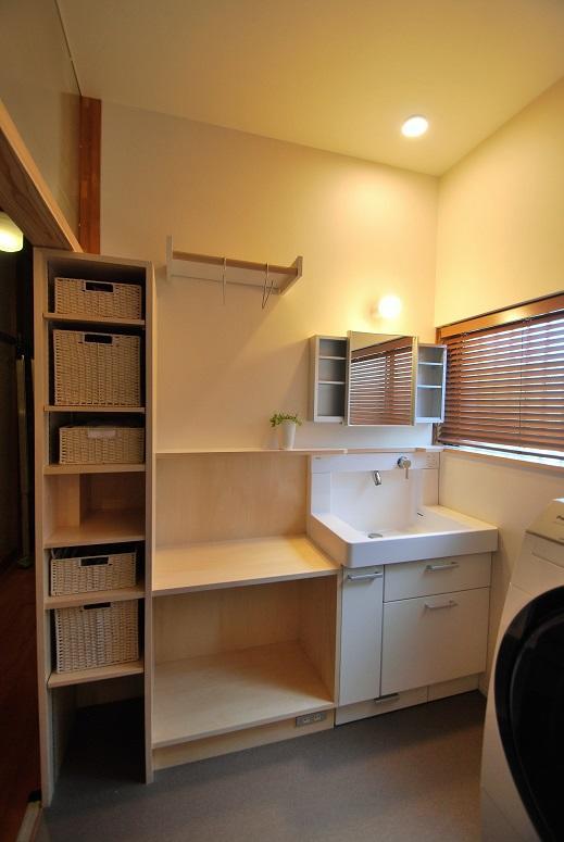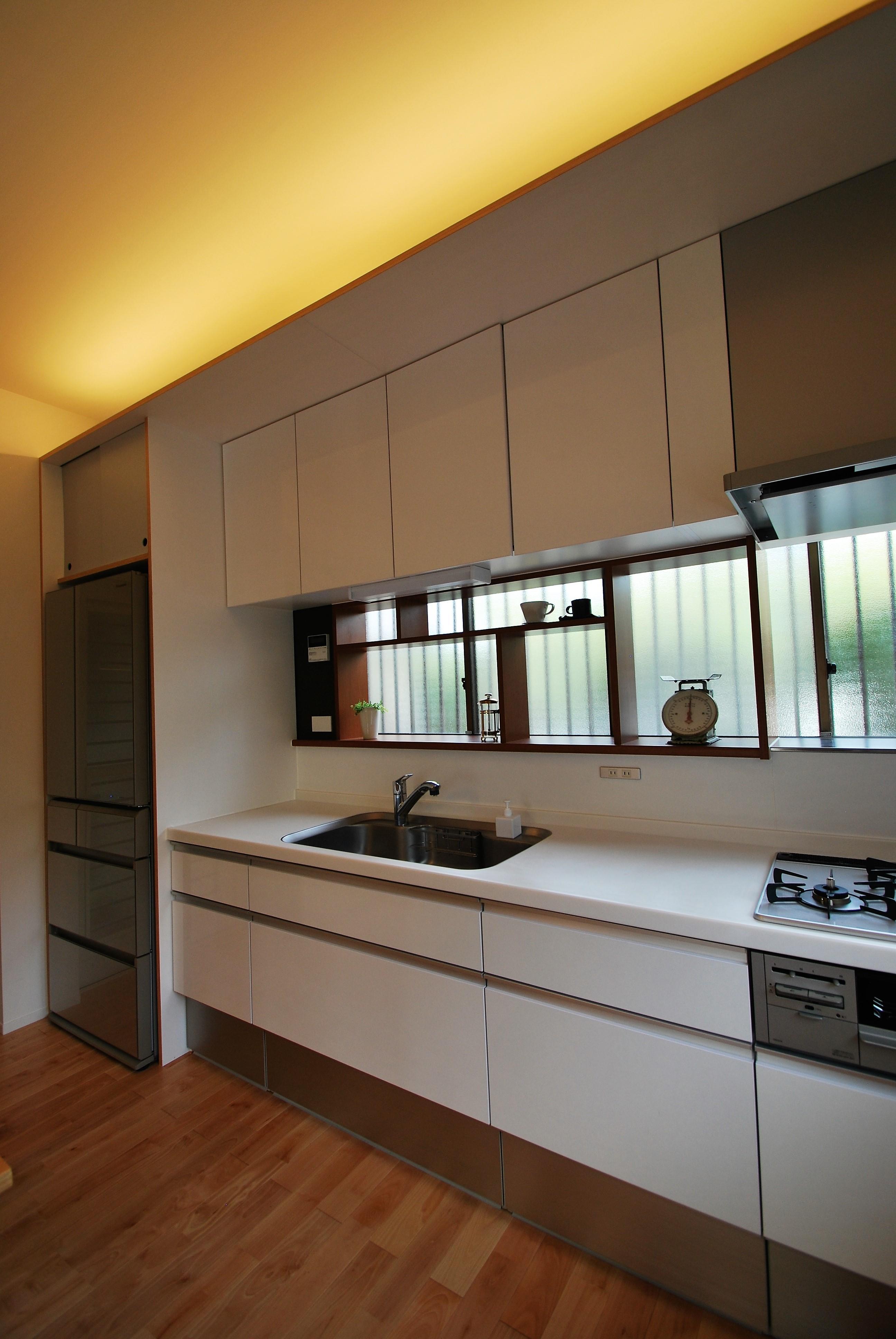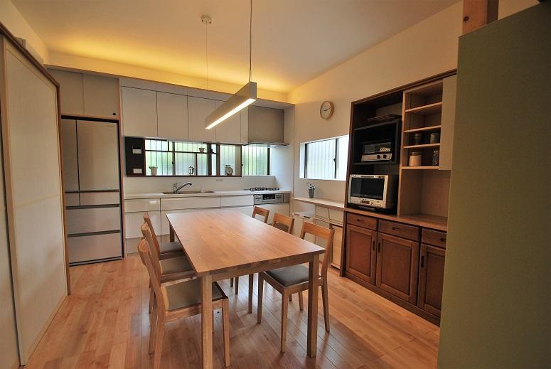 洗面化粧台の不具合やキッチンの床がベコベコ沈むようになり、内装と設備のリフォームをする事になりました。3世代で同居されているので、収納量をいかに確保できるかが最大の課題でした。特にダイニングキッチンに物が多く、人が通る時に家族に「ちょっとごめんね!」と椅子をどけてもらいながら通るような生活でした。キッチンの収納量を確保しつつ、家族6人がストレスなく通れるような空間にする事がご希望でした。 (設計:井上哲也建築設計事務所)