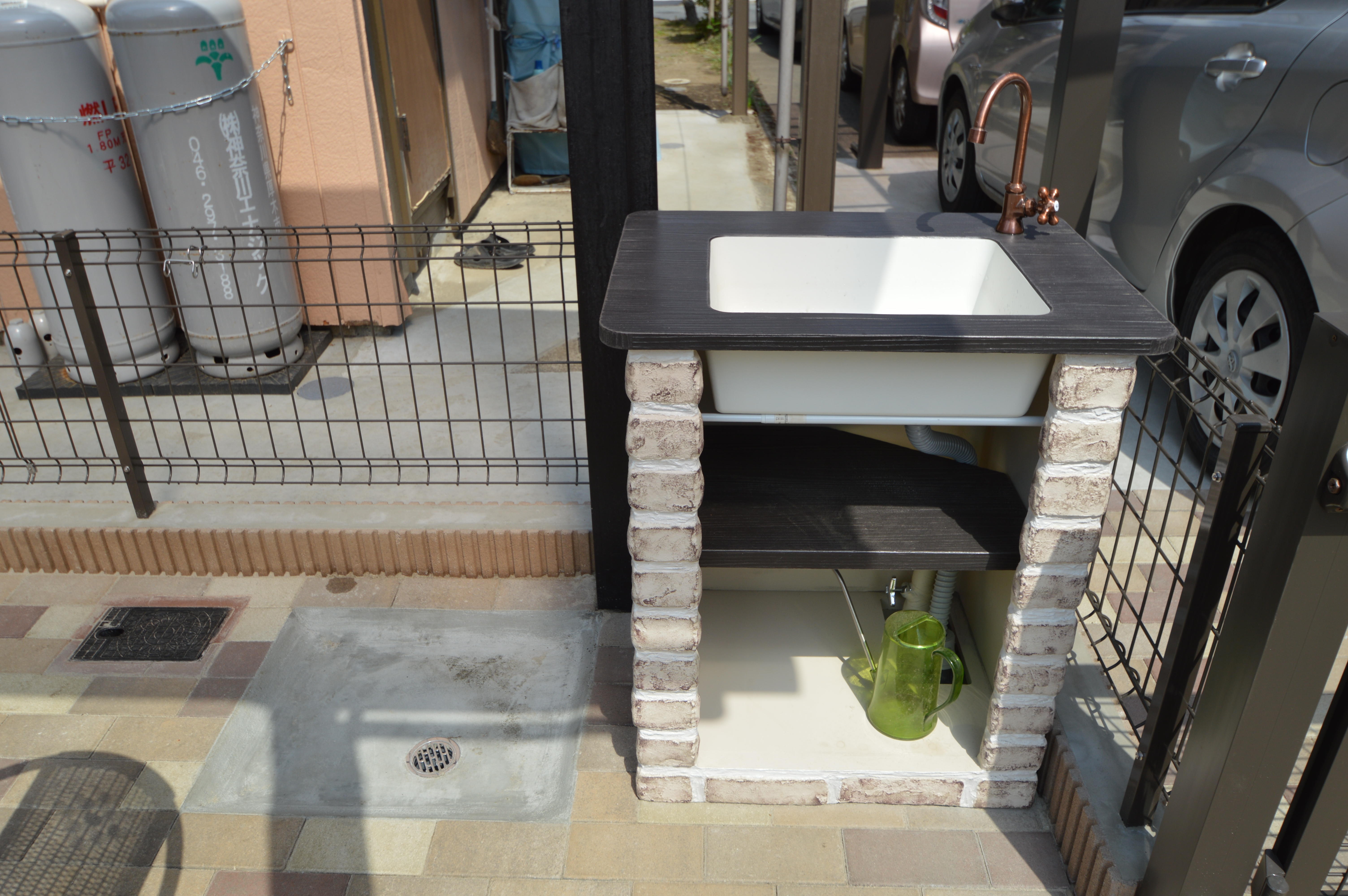 腰をかがまず楽な姿勢で使えるガーデンシンク。その横にはワンちゃんが足を洗える足洗い場もあります。水は散水栓ボックスからホースにつないで使います。