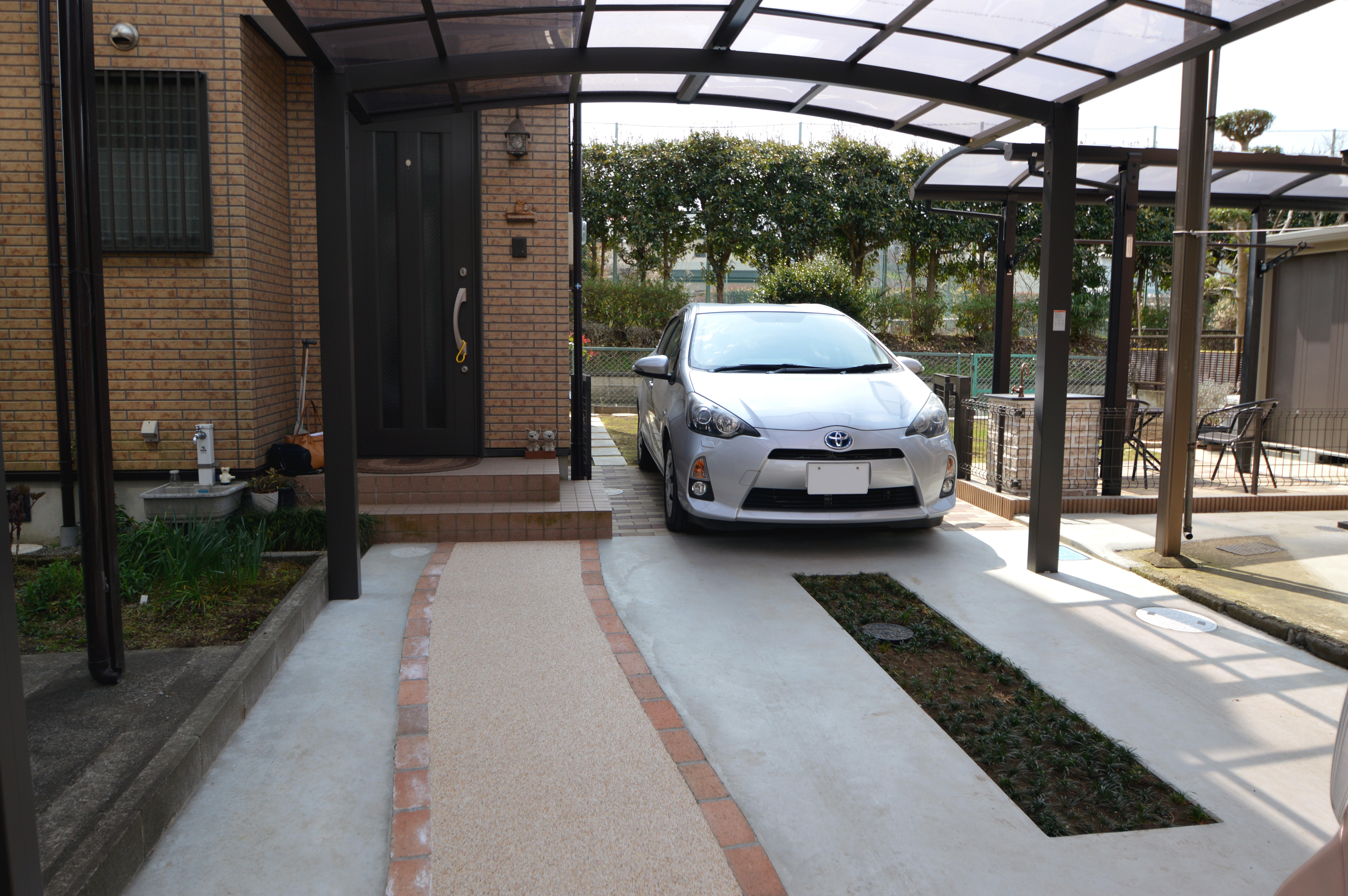 玄関アプローチは屋根付きで雨の日の車の出入りがとっても楽!玄関までの歩行スペースには色のきれいな砂利を固めた舗装材で滑りにくく明るい印象に♪ 全部コンクリートにすると冷たい印象になってしまうので、駐車スペースの下には土を残し玉竜を植えました。