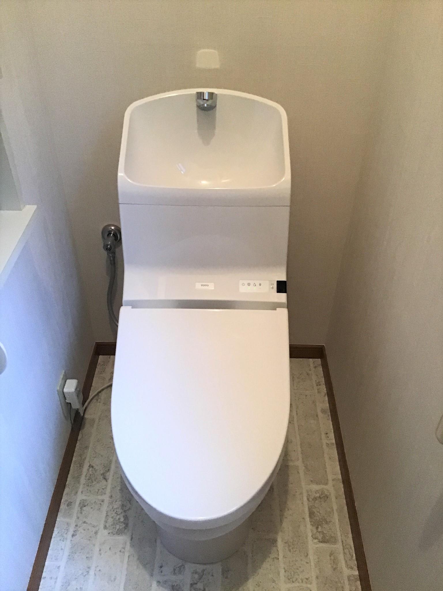 17年前にコラムホームで家を建てていただいたOB様からのご依頼でした。毎日お掃除されていても、17年も経つと床がふやけて黒ずんでしまいました。また、便器の水漏れがきっかけでリフォームする事になりました。木目調の壁紙とレンガ調の床材でかわいくナチュラルな雰囲気に仕上げました。