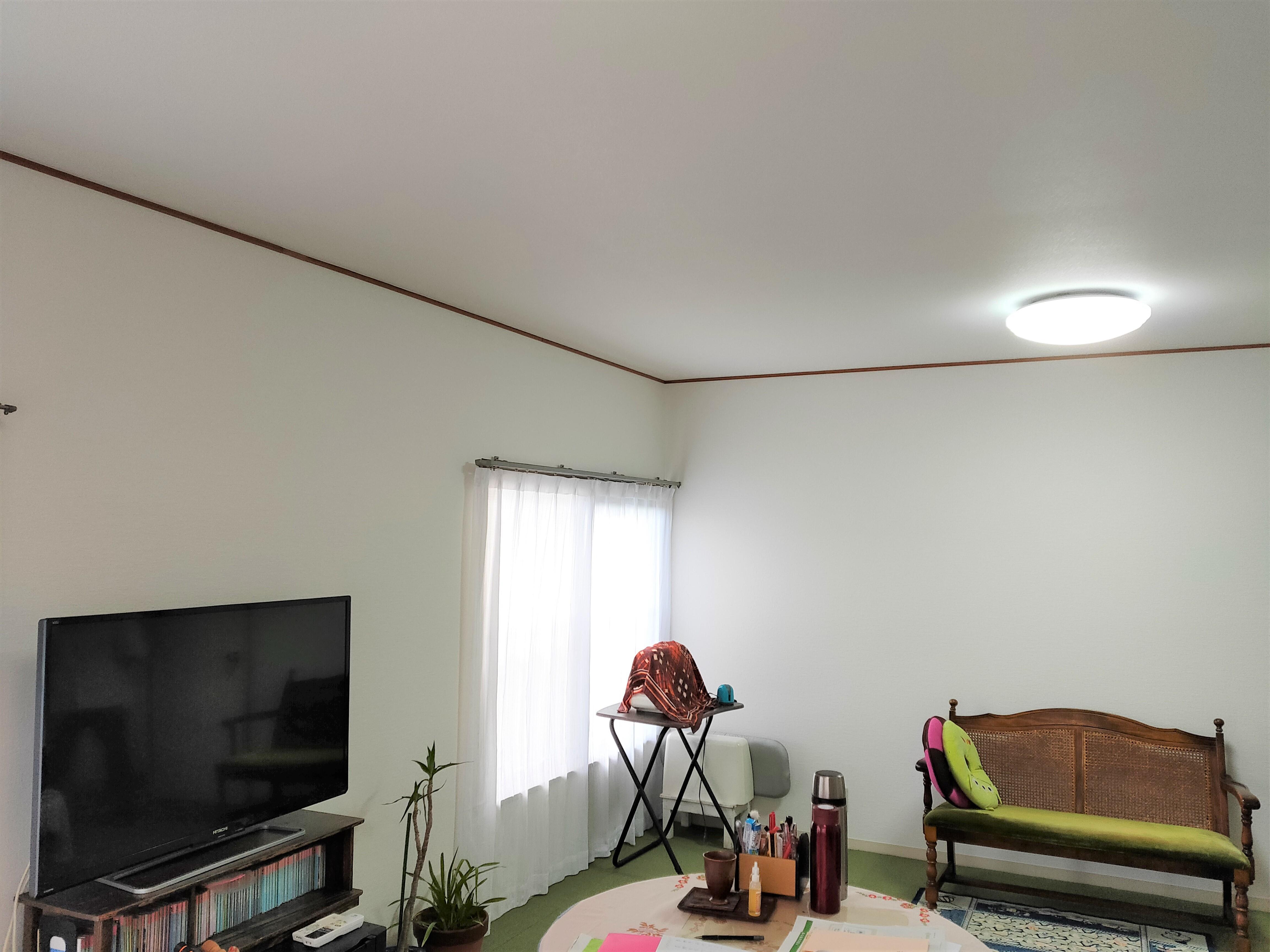 玄関ドア・勝手口ドア・縦面格子を交換しました。1Fリビングの天井には雨漏れのシミが出てしまっていたので、天井化粧パネルを補修しました。2F洋室は間仕切りと床のじゅうたんを撤去し、新しくフロアタイルを張り、壁天井のクロスを張り替えました。2Fトイレは便器の交換と壁天井のクロス張り替えを行いました。また、既存のベランダを撤去し、外壁の補修工事を行いました。
