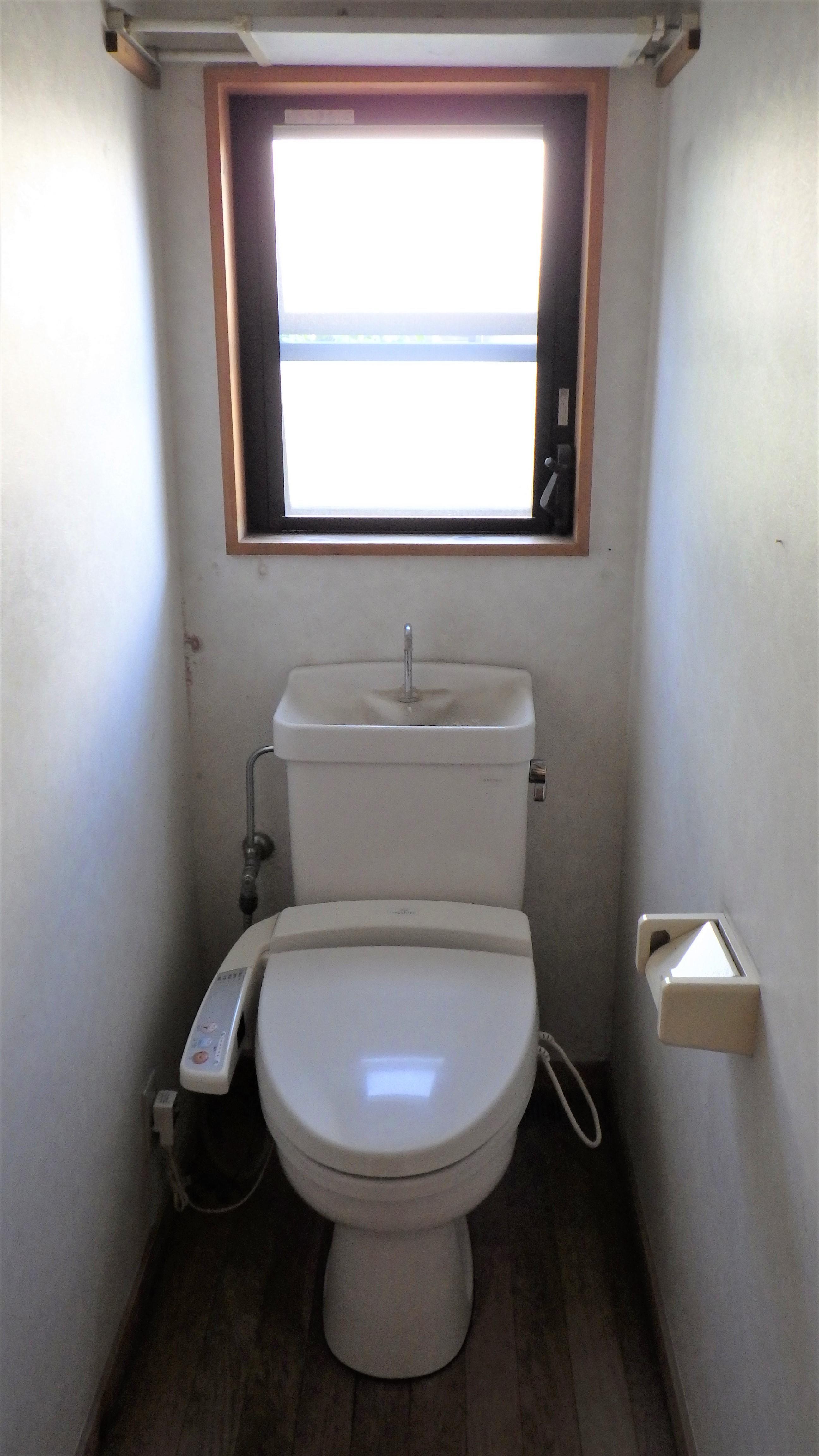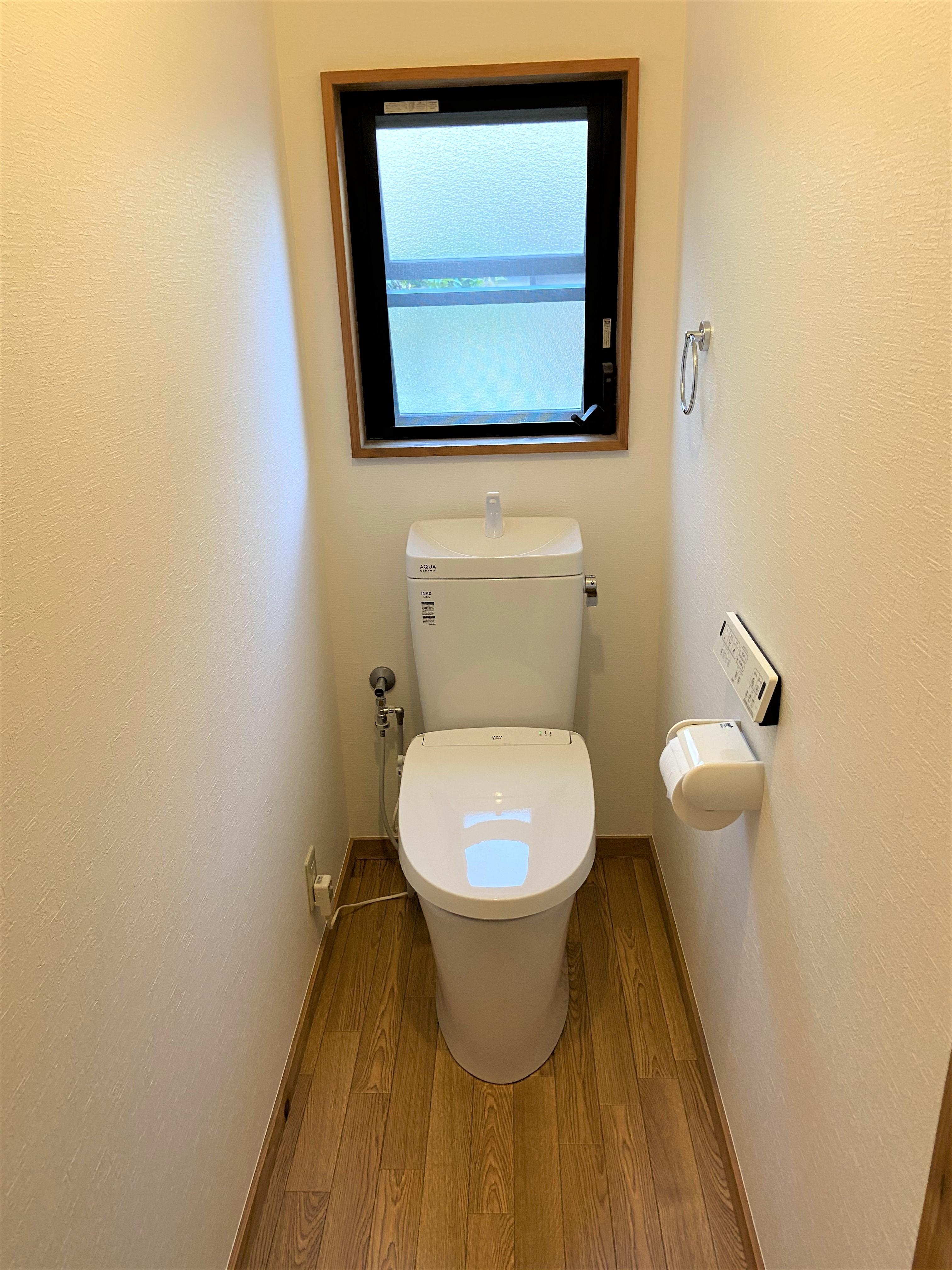 トイレの便器を交換し、既存の床は撤去して木目調のクッションフロアを張りました。壁と天井のクロスも張替えパッと明るくなりました。また、洗面脱衣室の壁天井クロスの張り替えも一緒に行いました。