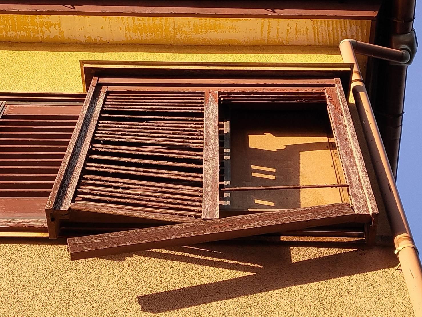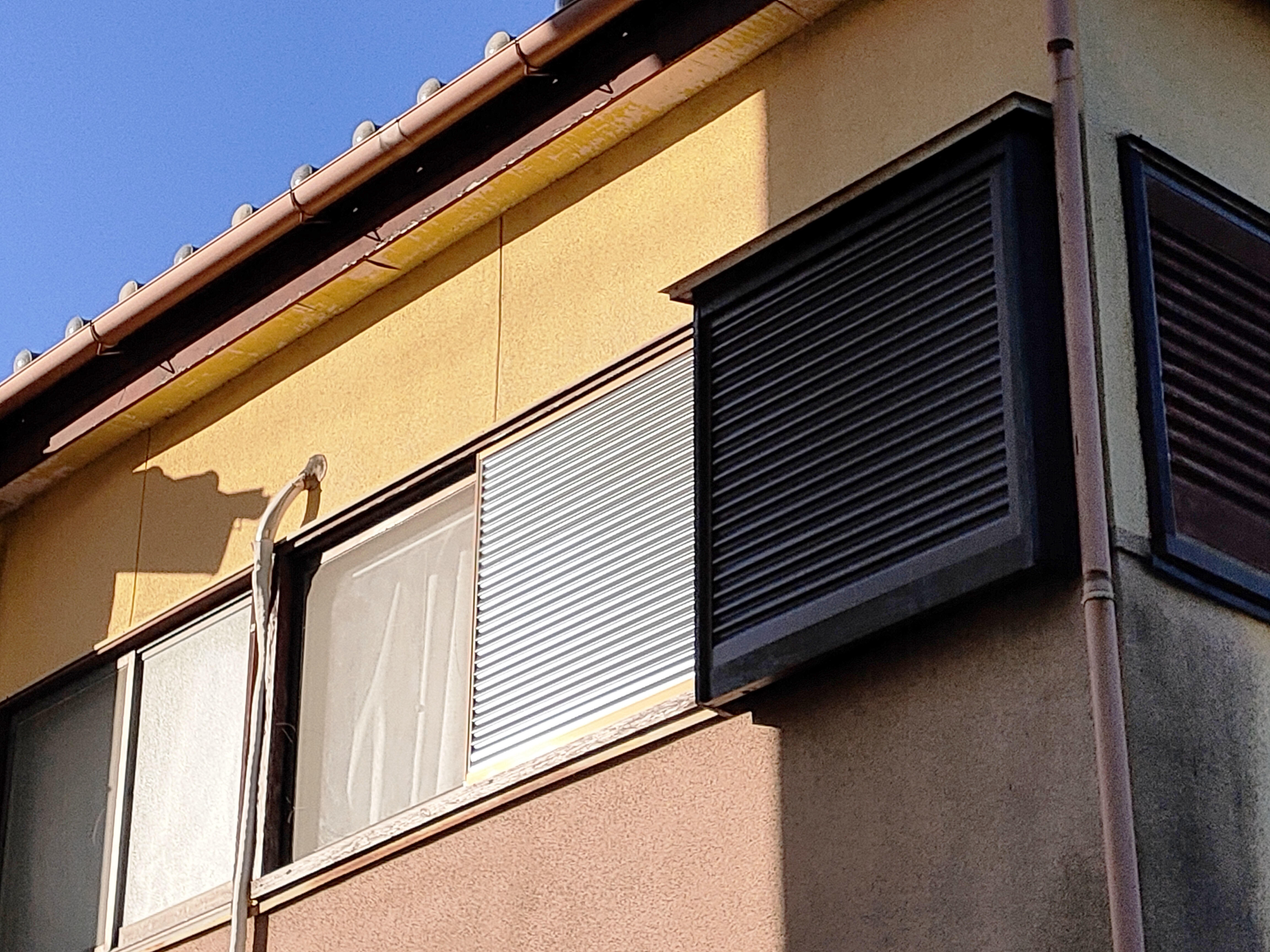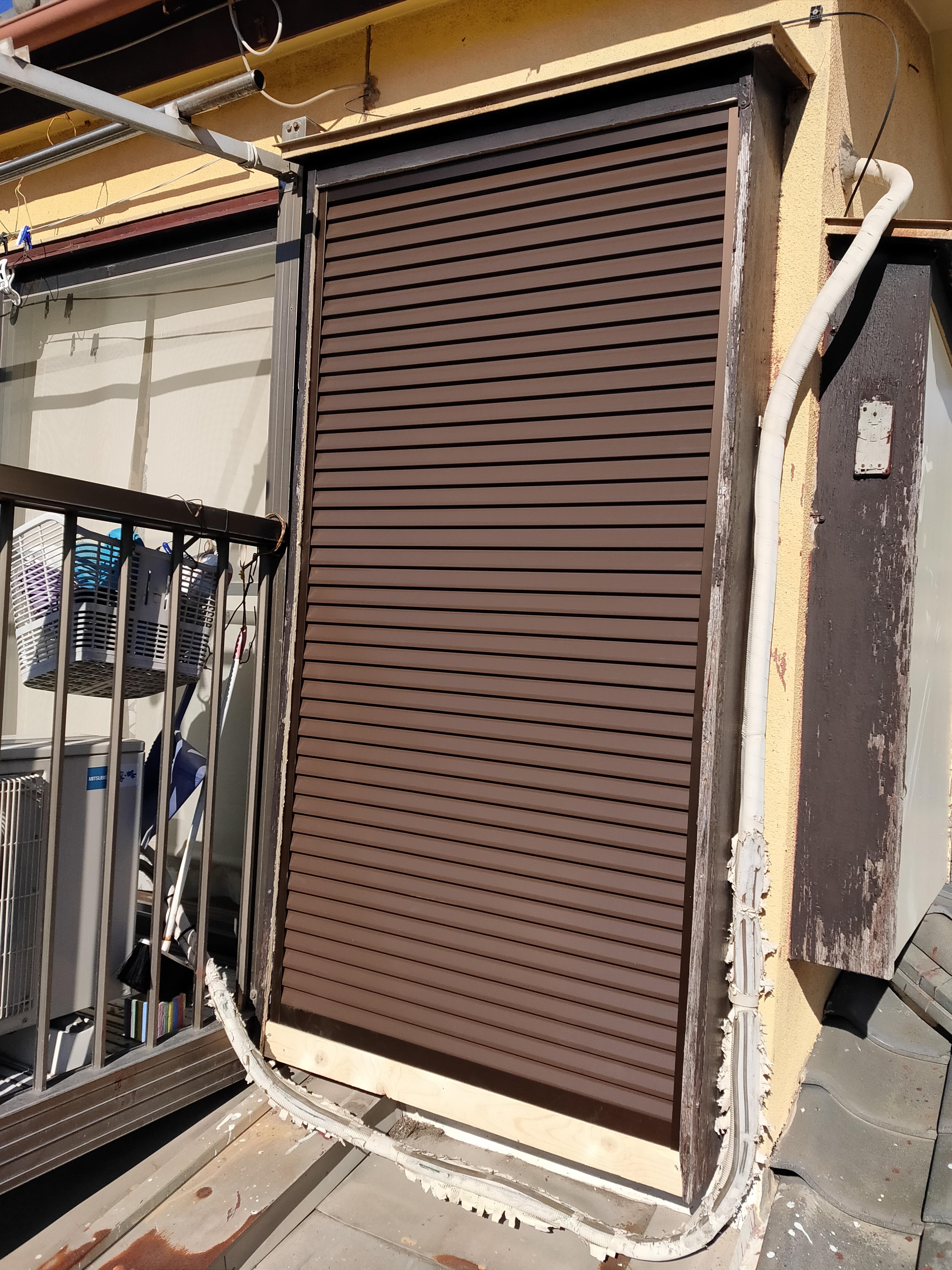 2F窓の木の戸袋が劣化し、今にも崩れ落ちそうな状態になっていました。丈夫で軽いアルミの戸袋と鏡板に交換しました。