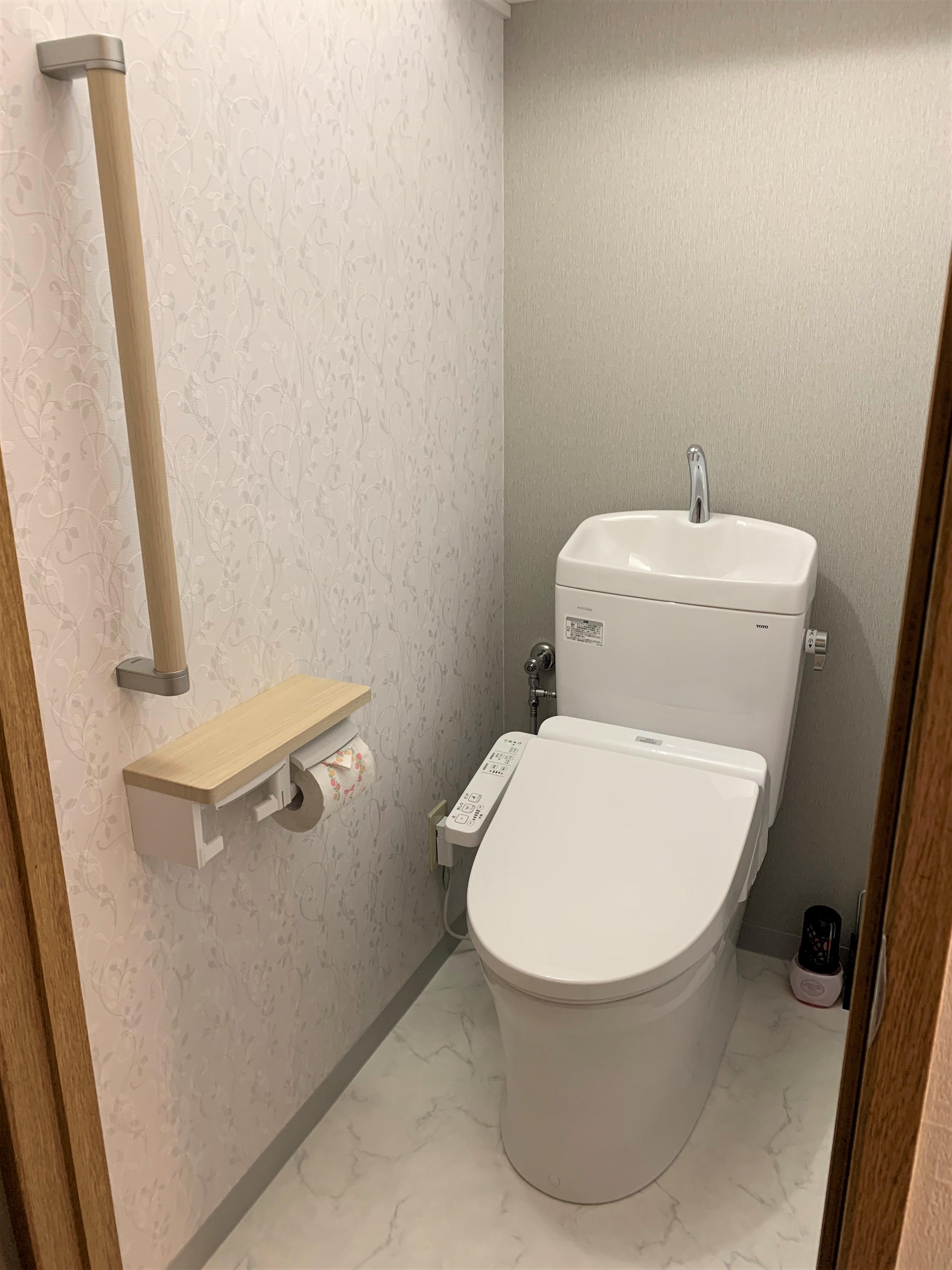 以前にトイレリフォームを担当させていただいたお客様から、「リフォーム前は孫がトイレに行く時は一緒にトイレに付いて行って、便器に座らせてあげて、用が済んだら降ろしてあげていたけど、リフォーム後は手すりを付けたので、孫が手すりを使って自分で便器に座って下りられるようになって楽になった!」というお話を聞いていました。手すりを使うはお年寄りだけではありません。お子様や妊婦さん、けがをした時にもとても便利です。 そのお客様の例をお話をして、立ち座りをサポートする手摺りや体重を掛けられる棚付き紙巻器をご提案させていただきました。 床がフローリングで張替えをご検討されていましたが、コストがかかるので上張りでき丈夫なフロアタイルでご提案させていただきました。