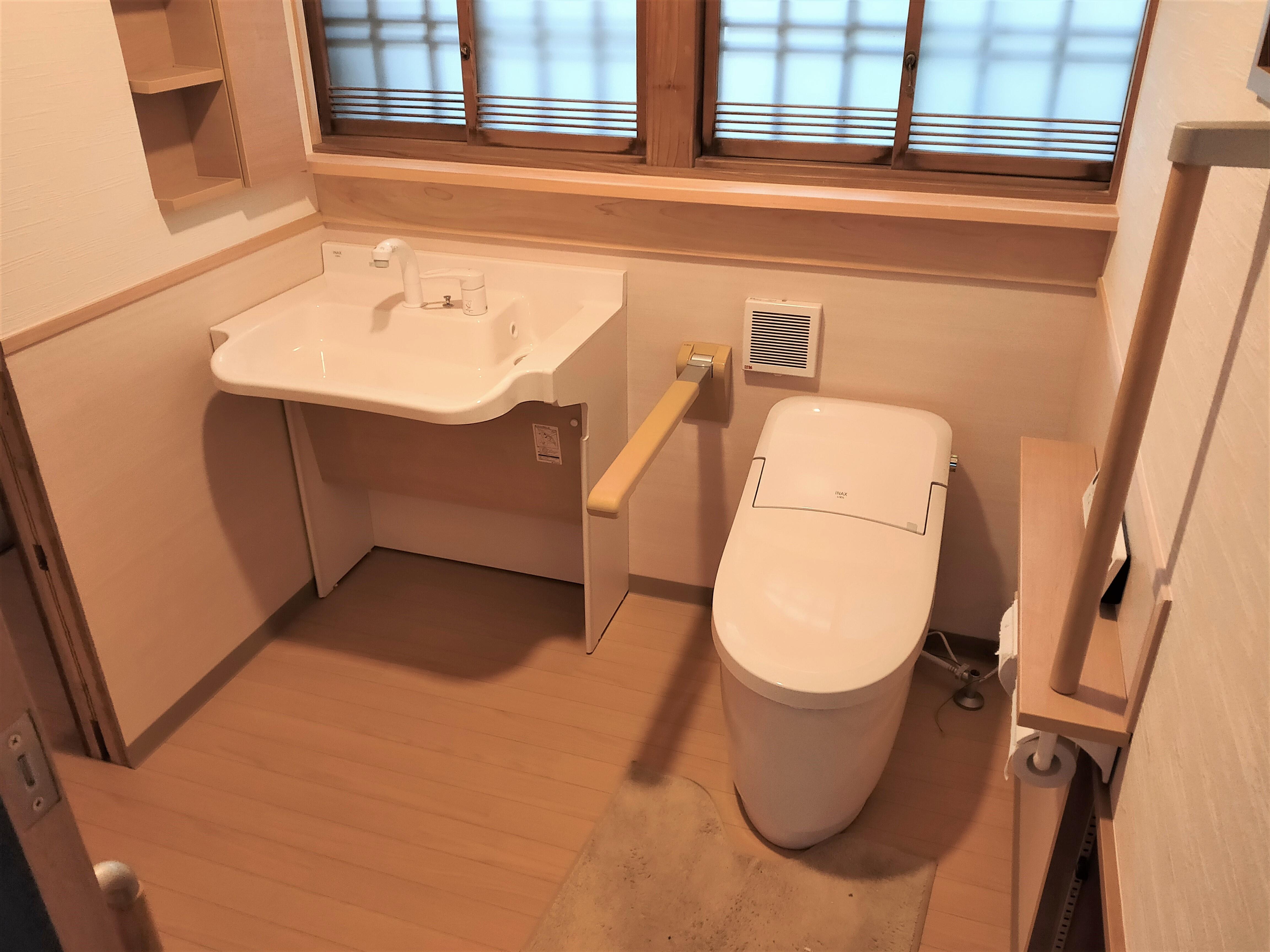 お父様がケガで体が動けなくなった事がきっかけで、介護保険を利用したリフォーム工事を行いました。将来車椅子になっても使いやすいように、トイレを広くして洗面化粧台を設置しました。また、トイレや浴室・脱衣室に手すりを設けました。浴室にはすのこ板を敷き、段差を解消しました。