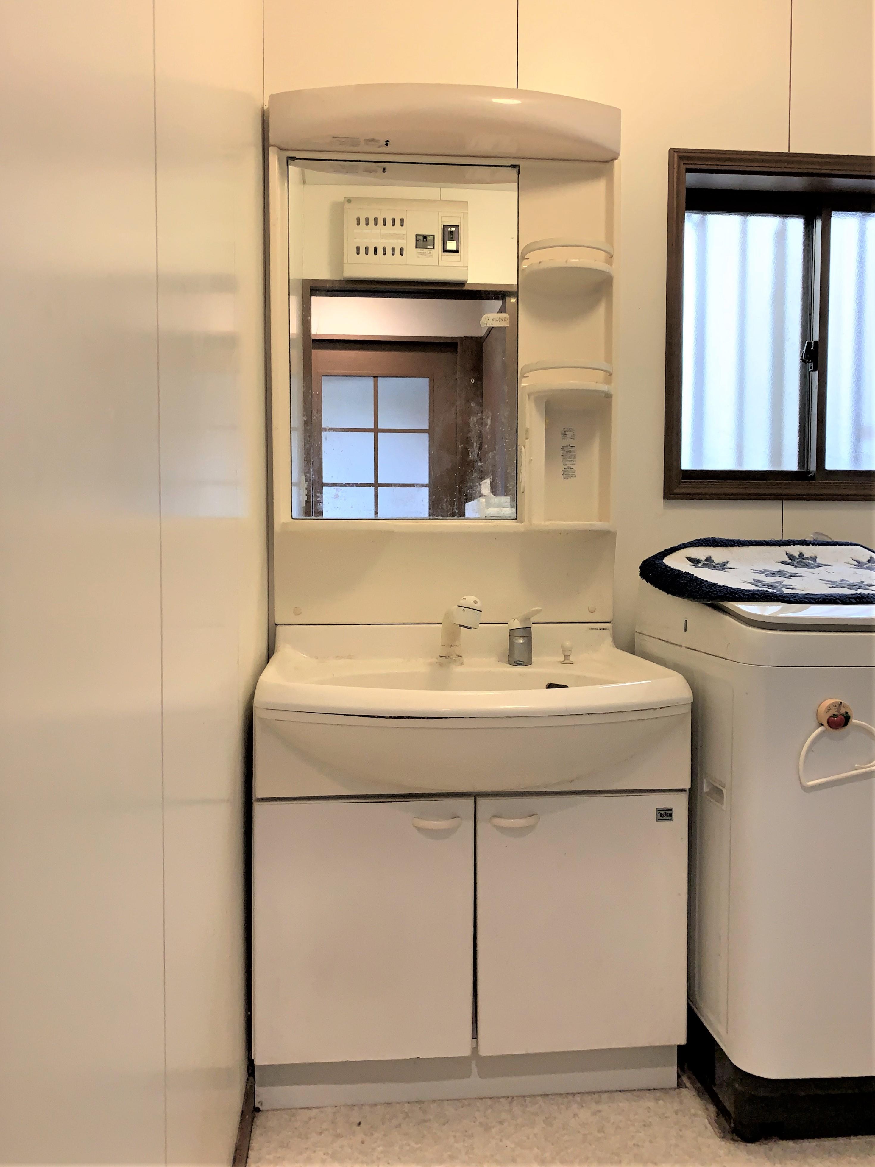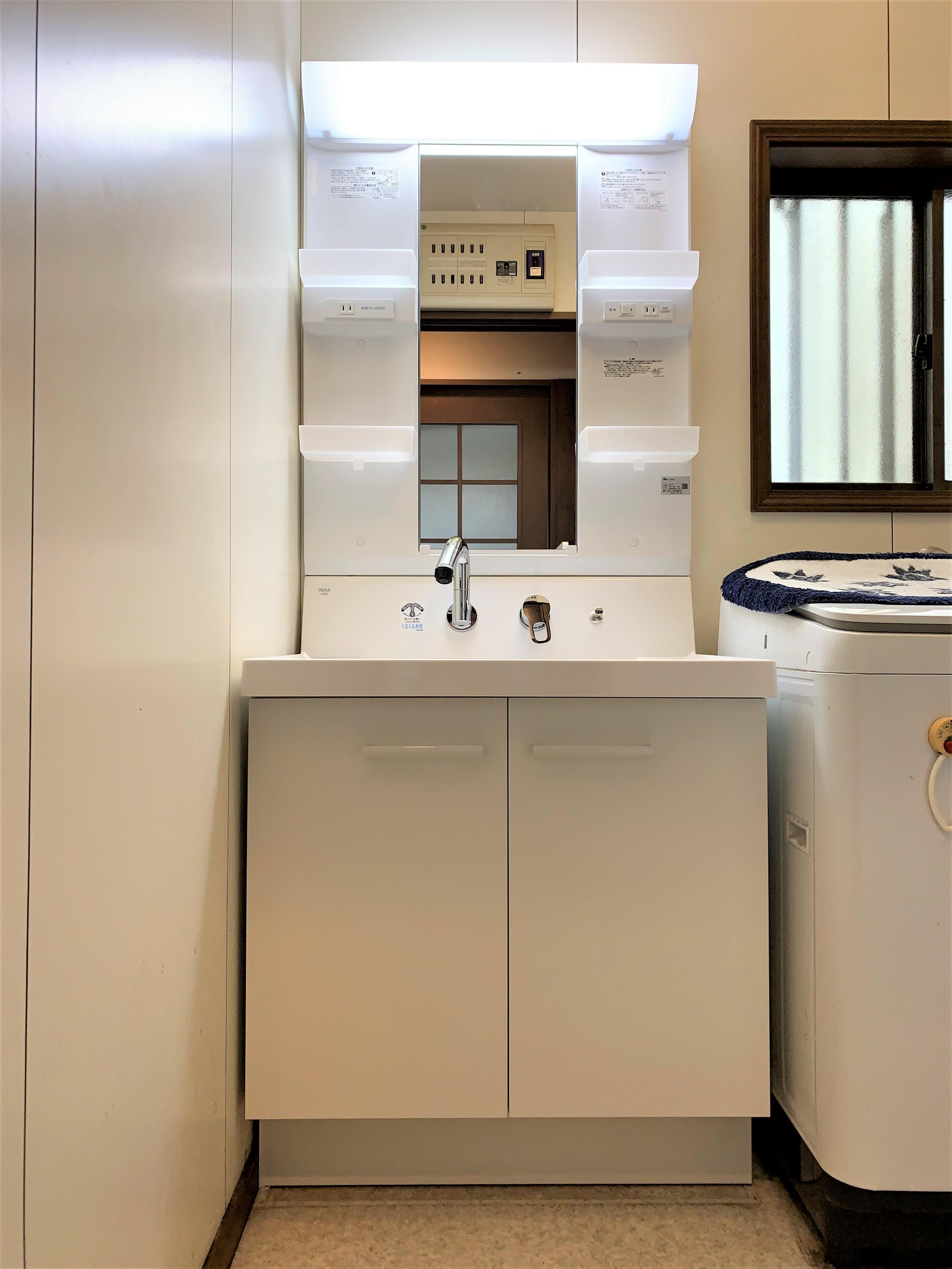 洗面化粧台の交換工事を行いました。壁付き水栓なので水栓まわりに汚れがたまりにくく、お手入れカンタンです。(LIXIL ピアラ)