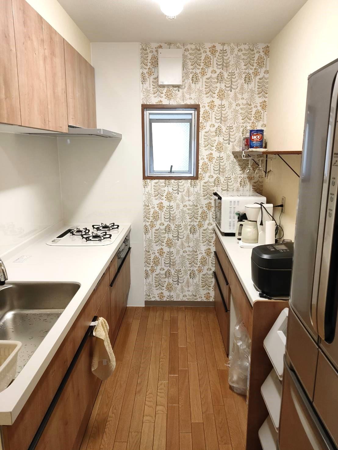 キッチンの木目柄と正面のアクセントクロスが北欧風のナチュラルな雰囲気です。キッチン背面のカップボードの上部には見せる収納棚を設けました。LIXIL ノクト L=2550扉:ライトグレインワークトップ:人造大理石 ベーシックホワイトシンク:ステンレス水栓金具:タッチレス水栓 ナビッシュハンズフリータイプ