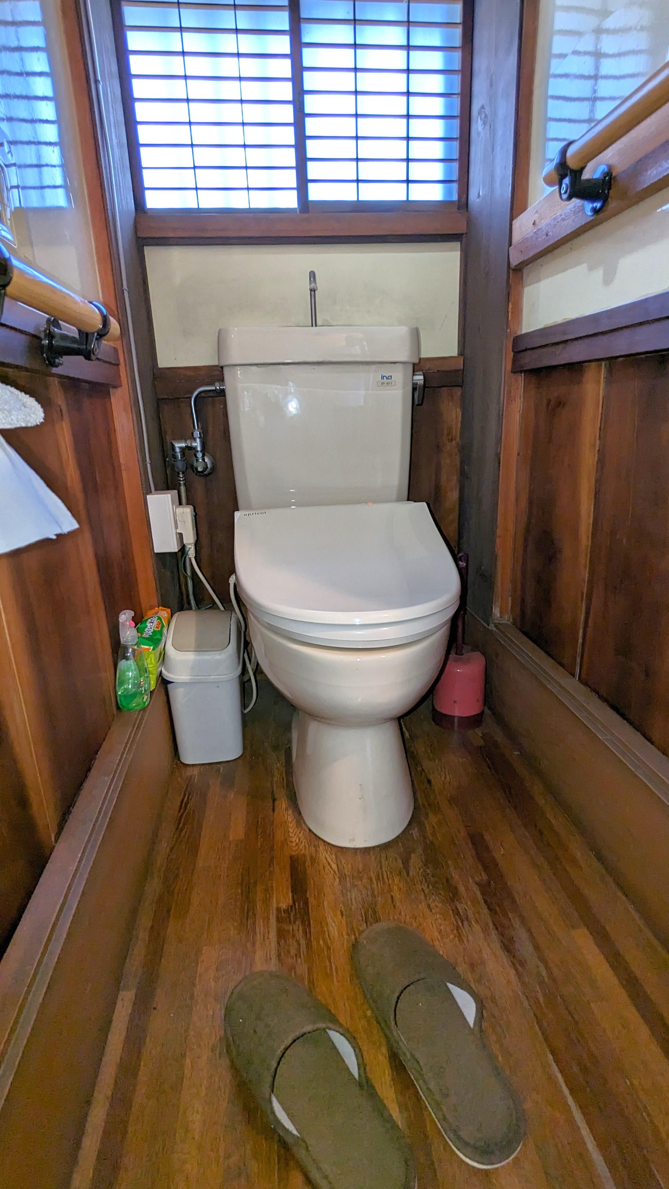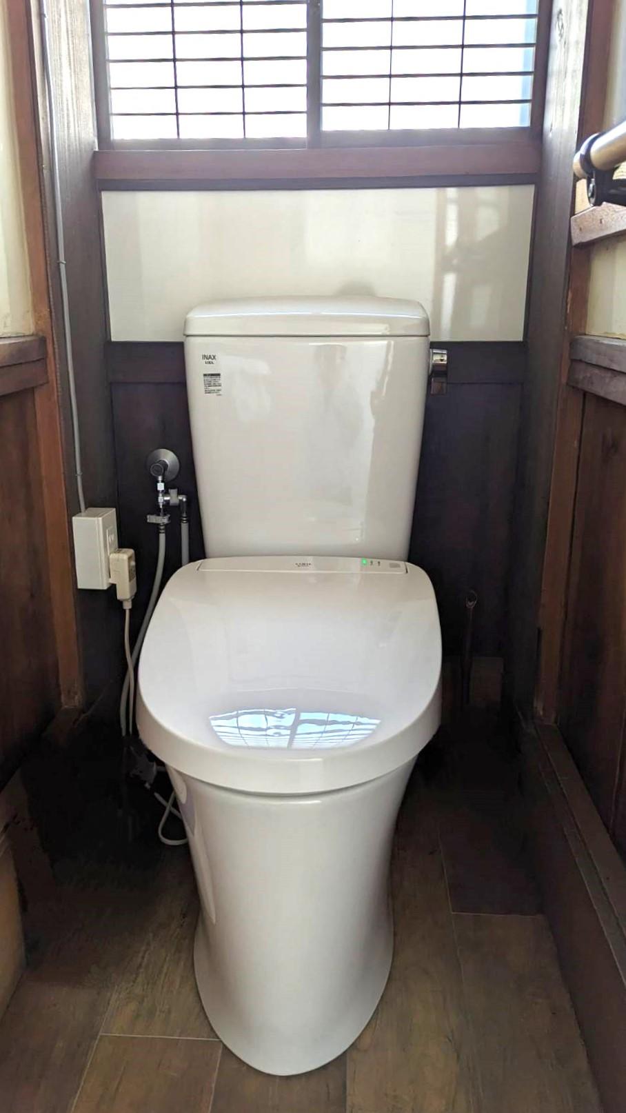 築100年の重厚感あるお宅のお客様用トイレをリフォームする事になりました。トイレの腰壁には桜の木が使われていて、その雰囲気を壊さないように床だけクッションフロアに張り替え、便器を交換しました。