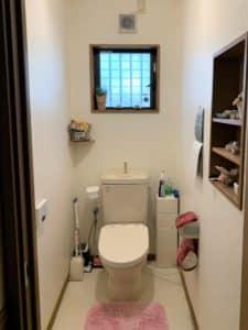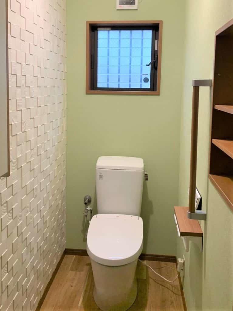 以前にもリフォーム工事をさせていただいたお客様より、トイレリフォームのご依頼をいただきました。壁・天井のクロス張り替え・床のクッションフロアの張替えに加え、将来に備えて手すりを設置しました。また、湿度の調節や臭いを吸い取る作用のある壁タイルのエコカラットを一面の壁に貼りました。
