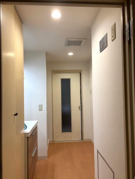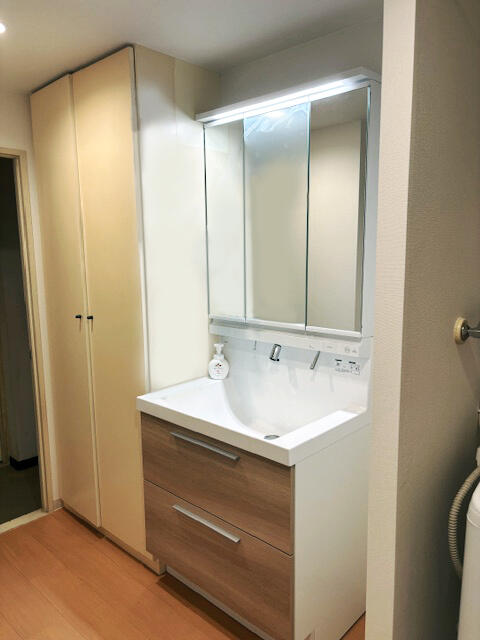 洗面所の照明の位置をずらし、洗面化粧台の照明とLEDダウンライトの計3か所から照らすことにより洗面所全体が明るくなりました。 壁・天井のクロスは白を基調とした無地をお選びいただき、縦に広く感じる空間を演出することができました。 また、床のクッションフロアをウッド調にしたことで、今までと違う雰囲気を味わえます。 お客様より、洗面化粧台のボウルの位置が高くなり使いやすくなった、掃除がしやすくなった、明るくなったと喜びのお言葉をいただき、うれしい限りです♪ これからもお客様にご満足いただけるよう丁寧なご提案を心がけてまいります。