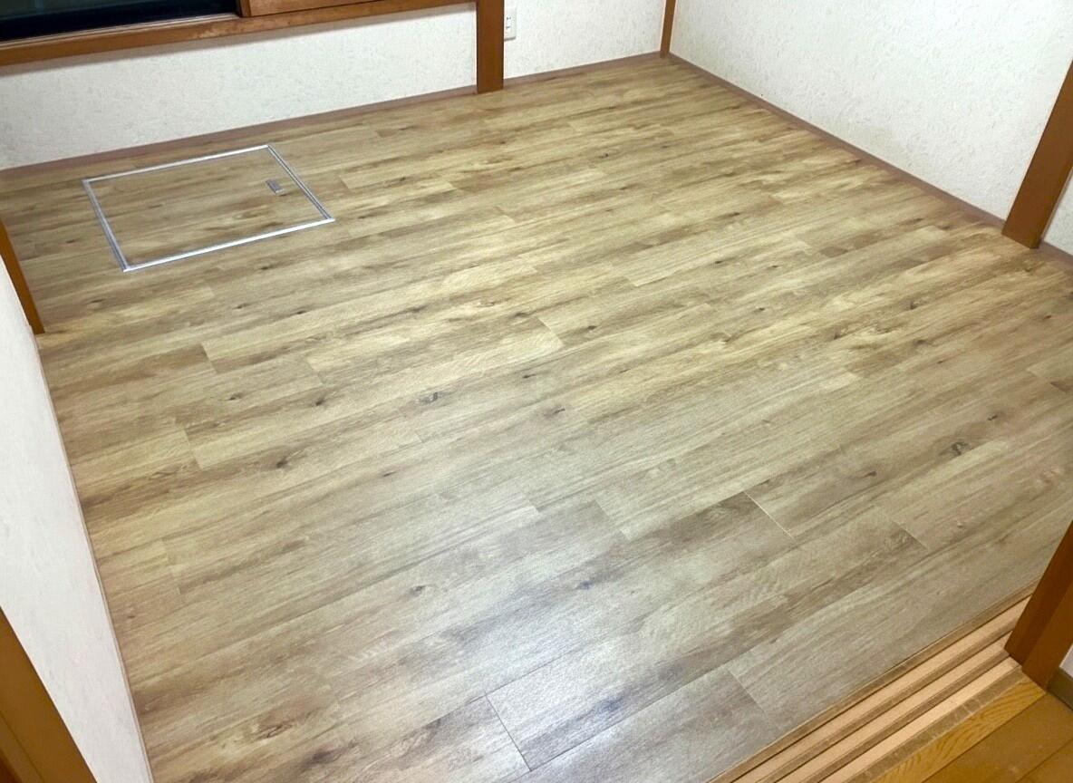 和室の床がボロボロになって困っていましたが、リフォームして本当に良かったです。畳をフロアタイルにしたことで掃除がしやすくなり、押入れだったスペースも広く使えるようになりました。木目調のフロアタイルが部屋を明るくしてくれ、和洋どちらの雰囲気も楽しめます。床下収納庫もついて床下の点検も出来て安心です。