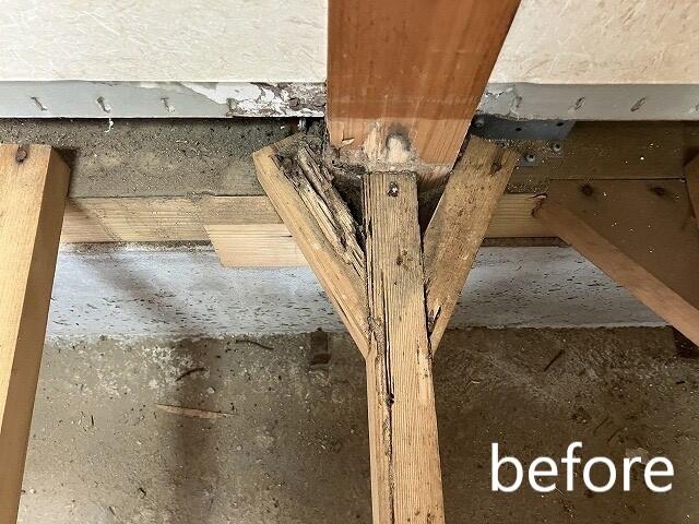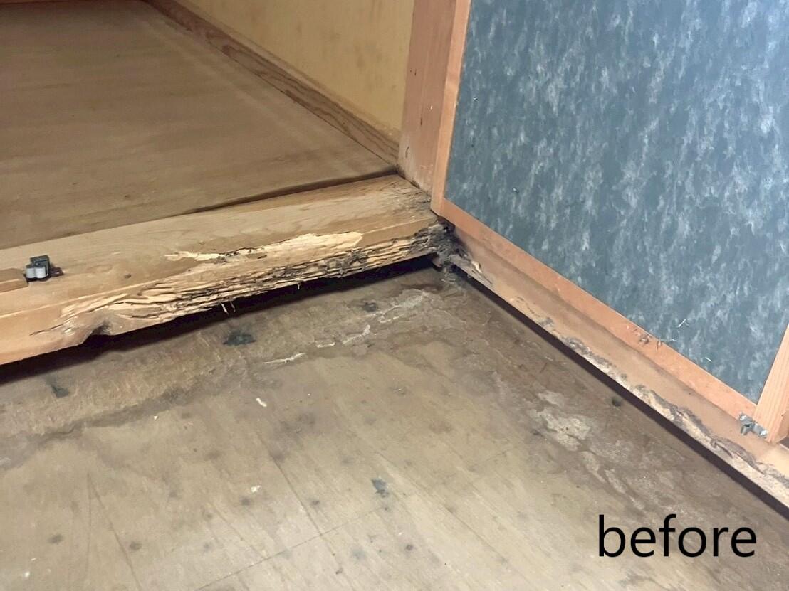 今回のリフォームでは、シロアリ被害で傷んだ床を改修し、安全・快適にすることを最優先に施工しました。畳からフロアタイルに変更することで、見た目のデザインだけでなく、お掃除のしやすさも向上しました。押入れ部分も部屋の一部として活用できるよう工夫しました。床下点検も可能な収納庫を設置したので、将来も安心です。