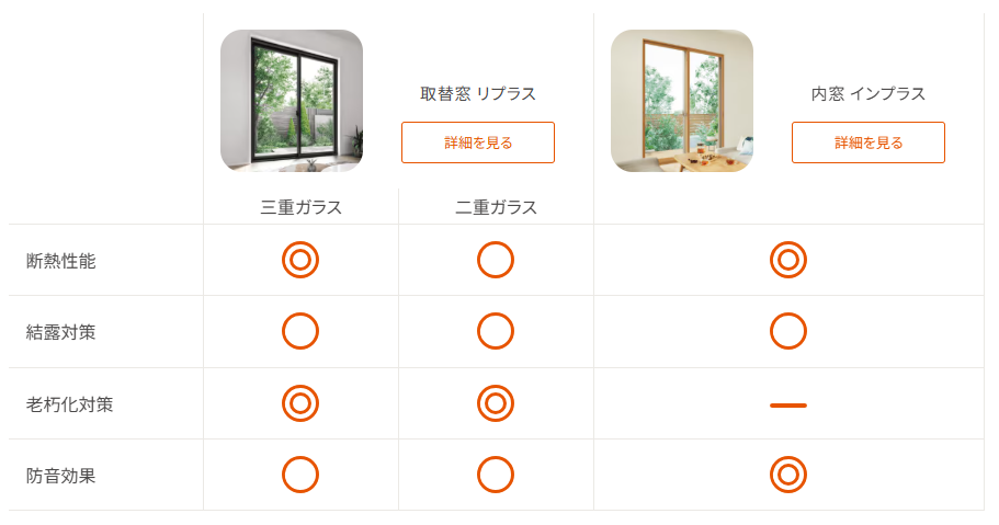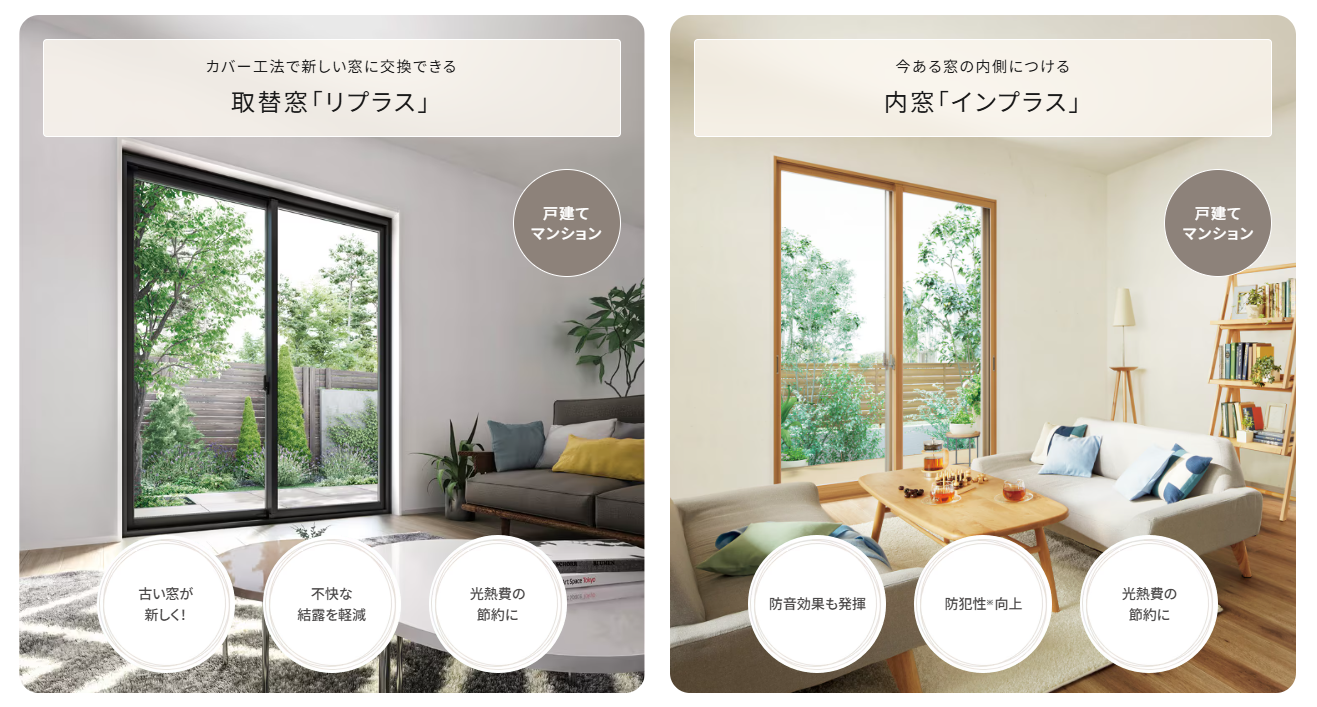 窓断熱には、今ある窓の内側につける内窓『インプラス』と、カバー工法で新しい窓に交換できる取替窓『リプラス』の2つの方法があります。