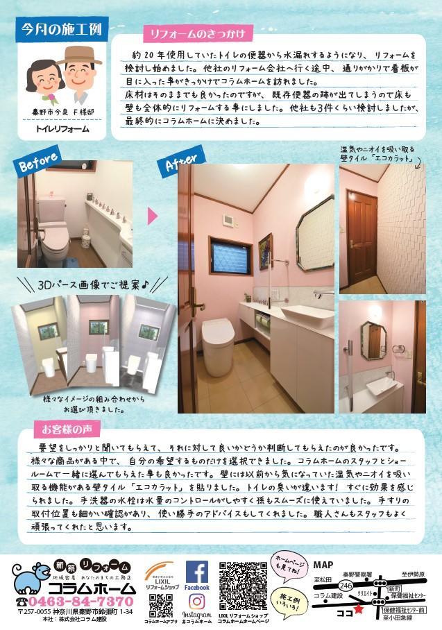 今回の施工例はトイレリフォームです。3Dパース画像でイメージを膨らませながら、壁紙や床の様々な組み合わせの中からお選びいただきました。是非ご覧ください。