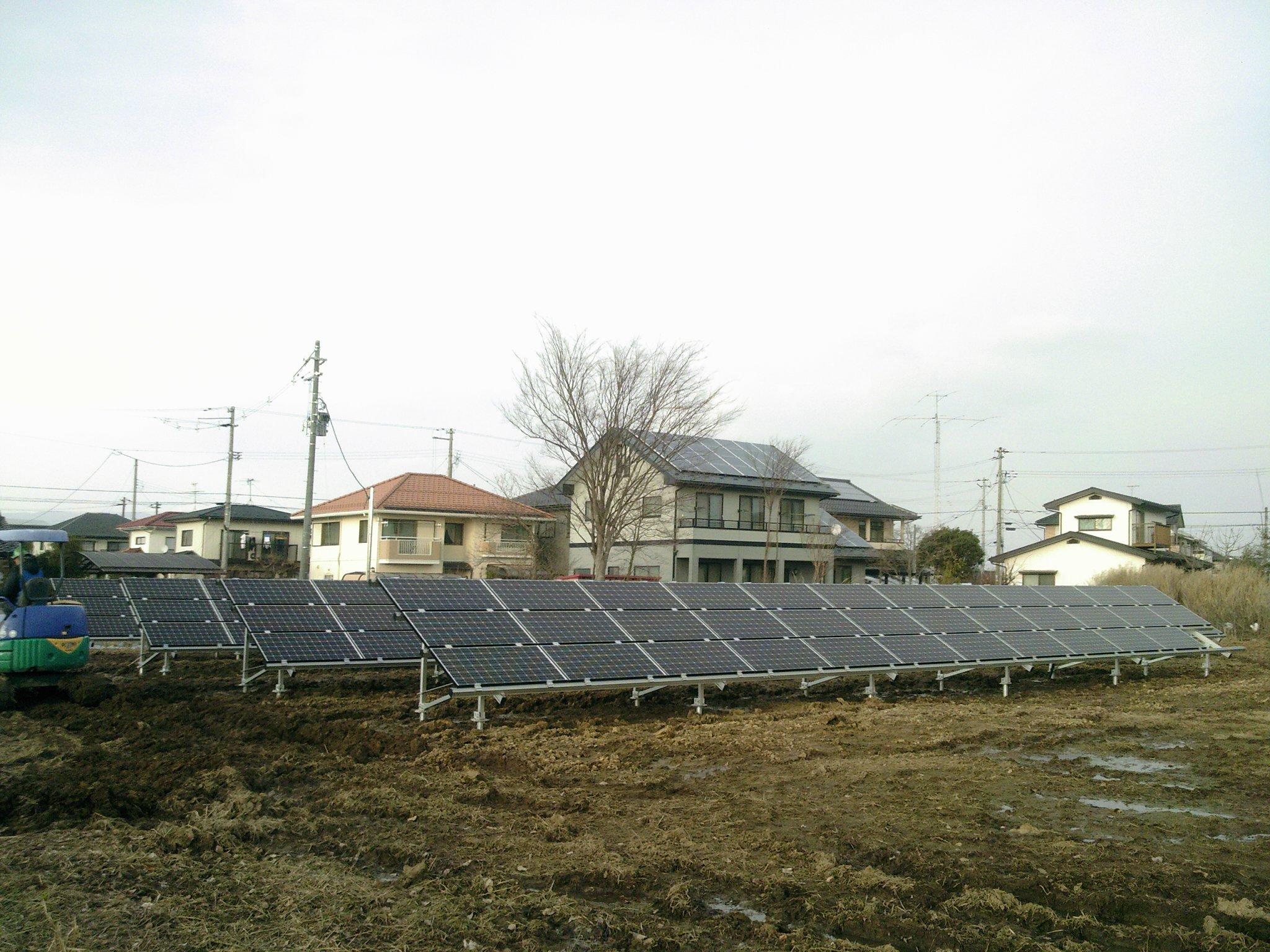 現在休耕地になってしまっている田んぼがあり、そこへ太陽光発電ができないか?との お問い合わせで始まりました。農地法により設置できない場所もある為、農業委員会の 方へ問い合わせたところ、届け出により可能となり工事がスタートしました。 整地をし、スクリュー杭にて架台を組み、パナソニック製パネル244wを218枚のせ53.2kw としました。パワーコンデショナーを9台設置して50kw未満低圧で連系しています。 普通の野立てでは海外製のパネルを使う場合が多いですがパナソニックの高効率 パネルを使ったため、売電量もかなり高いと思います。 田んぼや畑など現在使っていない。跡継ぎがいないのでもう農業はやらない。等々 休耕地の有効活用をしたいとお考えの方はぜひ当社へお問い合わせください。