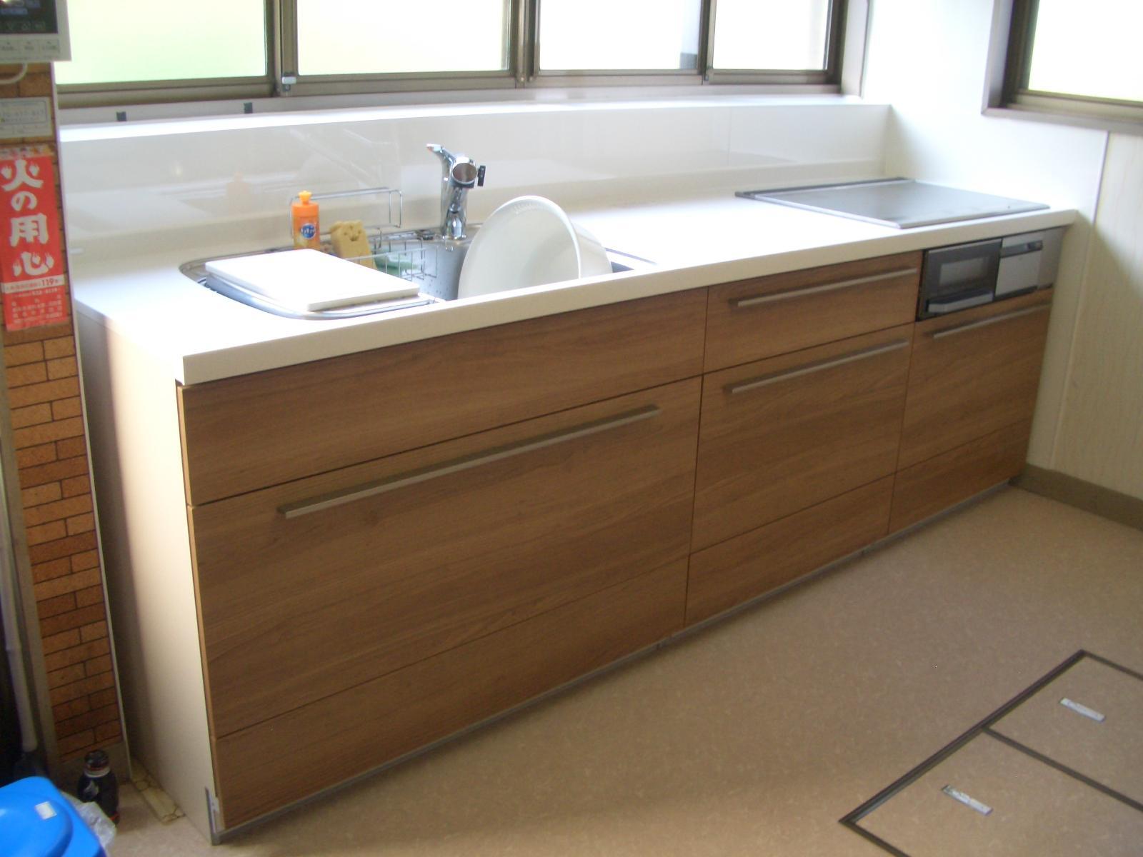 古くなったシステムキッチンの入替え工事。(施工前)当時はハイモデルタイプのキッチン でしたが、さすがに古さは否めませんでした。そこに「LIXILサンヴァリエ・アレスタ」を設置。 クオリティウッドの優しい色合いと人造大理石の天板、センターポケットシンクも広く使い やすくなりました。引き出し式のシンク用キャビネットもロングスライドで奥のものも 出し入れが簡単。 使いやすくて美しい、お料理するのが楽しくなりますね。