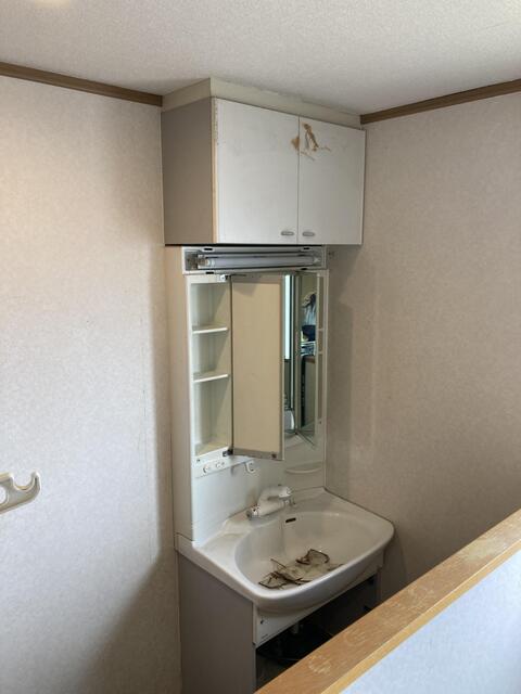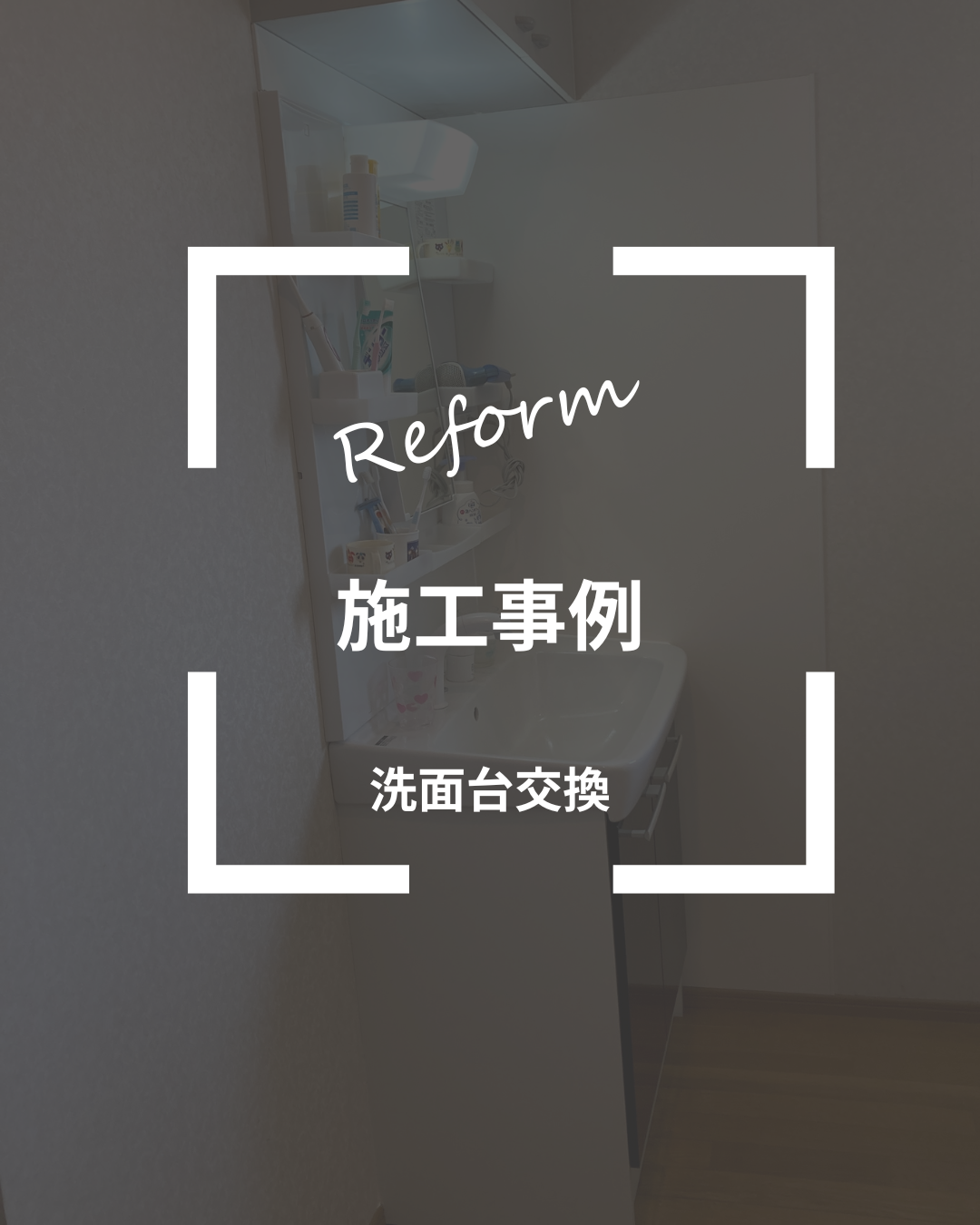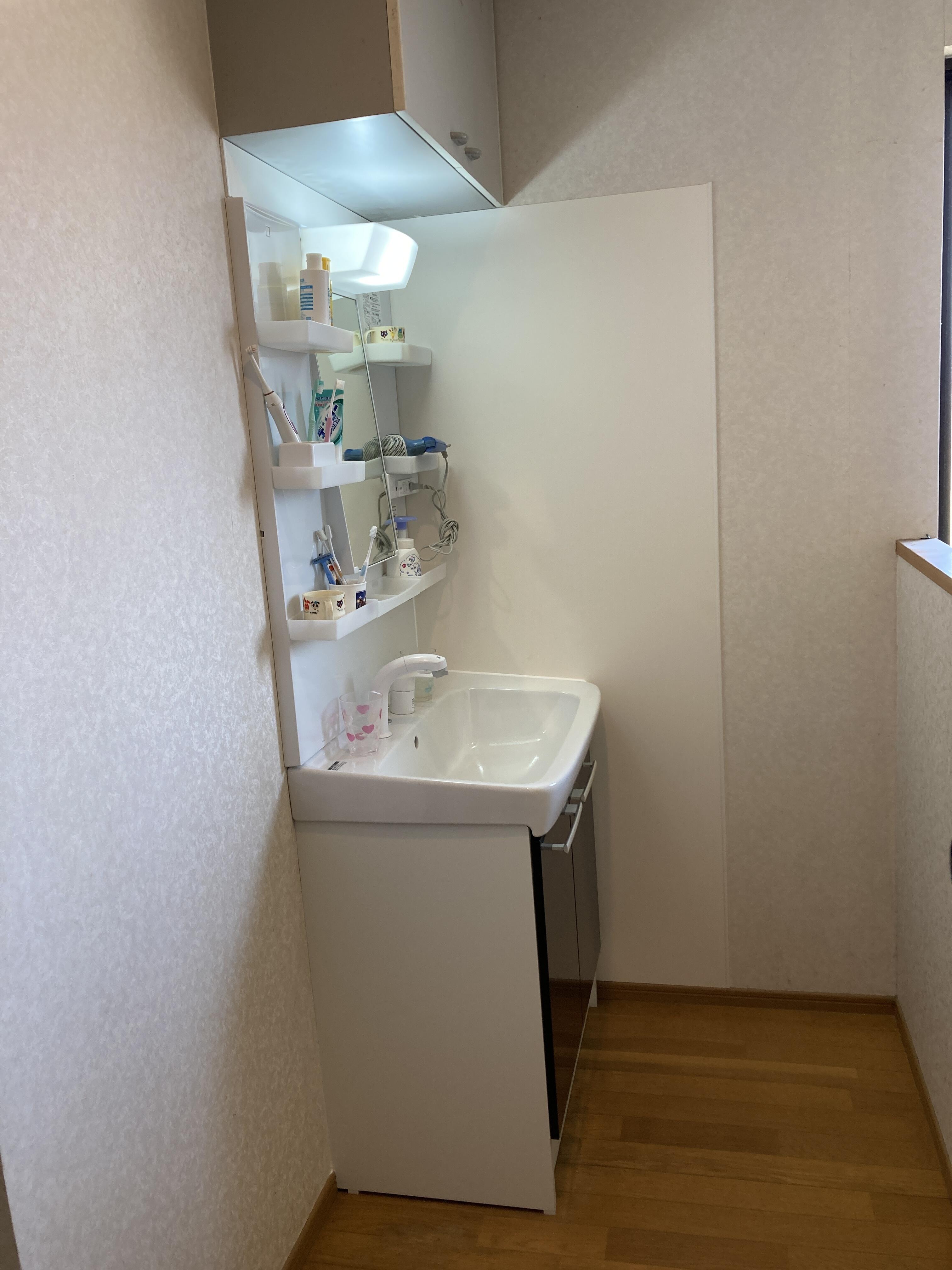 クロスまでは張り替えず、メラミン化粧板を部分的に貼る事で、壁の補修を兼ねながら、水はね対策になるようにいたしました。また洗面台と壁との隙間をシーリングでふさぎ、水が隙間から落ちない様に配慮いたしました。