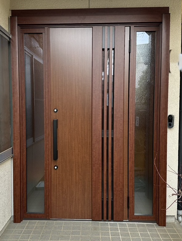 経年劣化したアルミ製の引き違い戸から、木目調の片開き玄関ドアへ入れ替えたことで、玄関まわり全体の印象がぐっとスタイリッシュになりました。