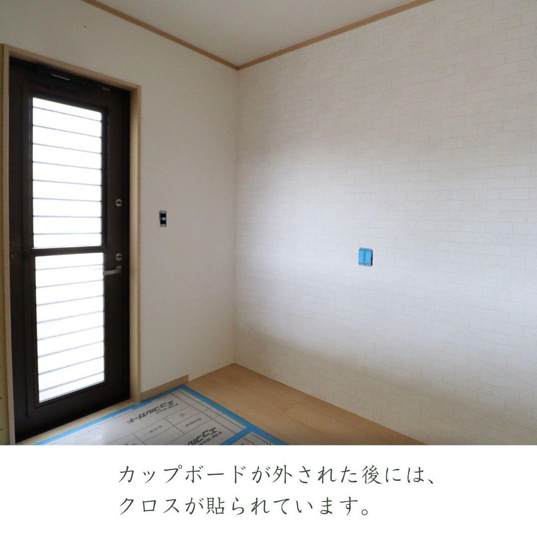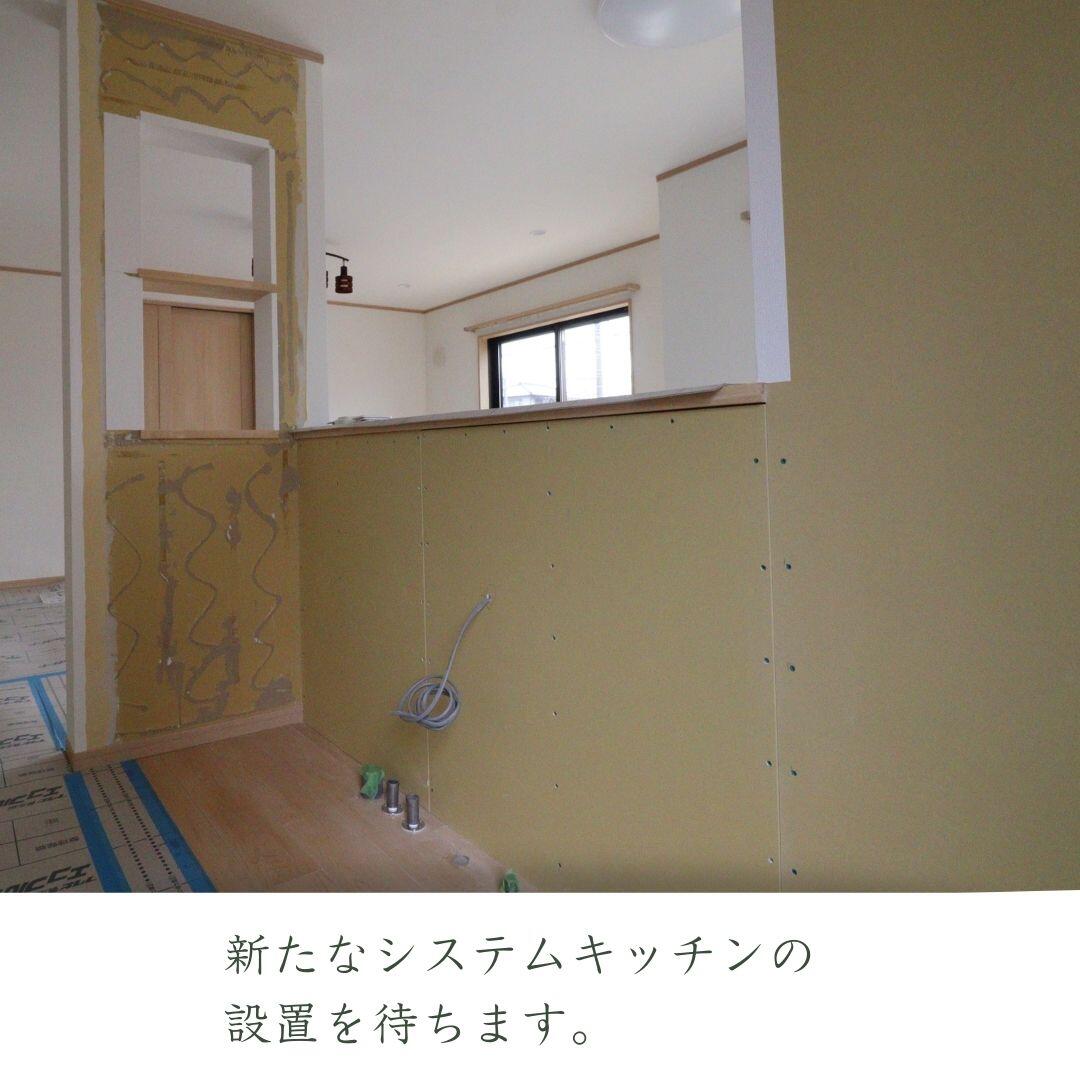 既存のシステムキッチンとカップボードを取り除き一部クロスが貼られています。