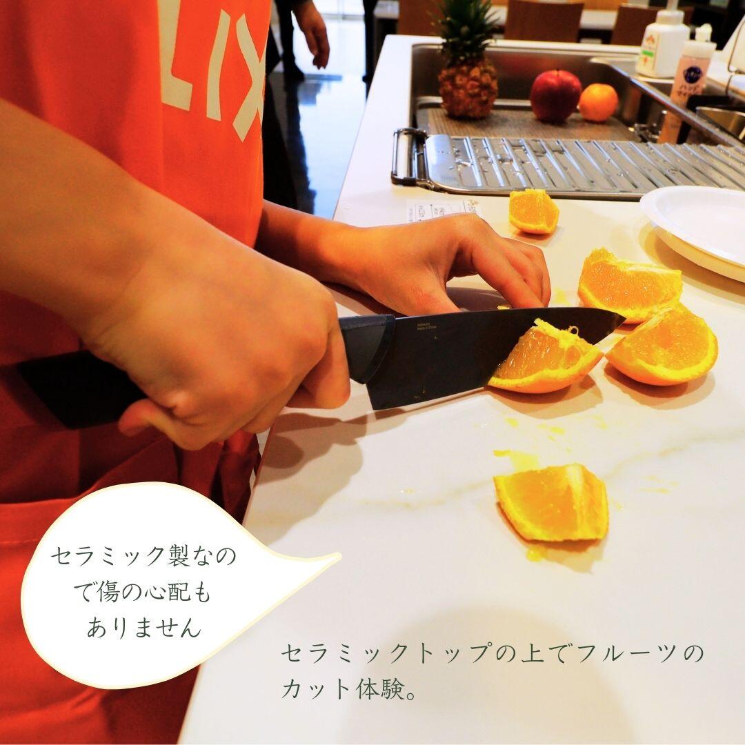 セラミックトップの上でフルーツをカット体験をし、