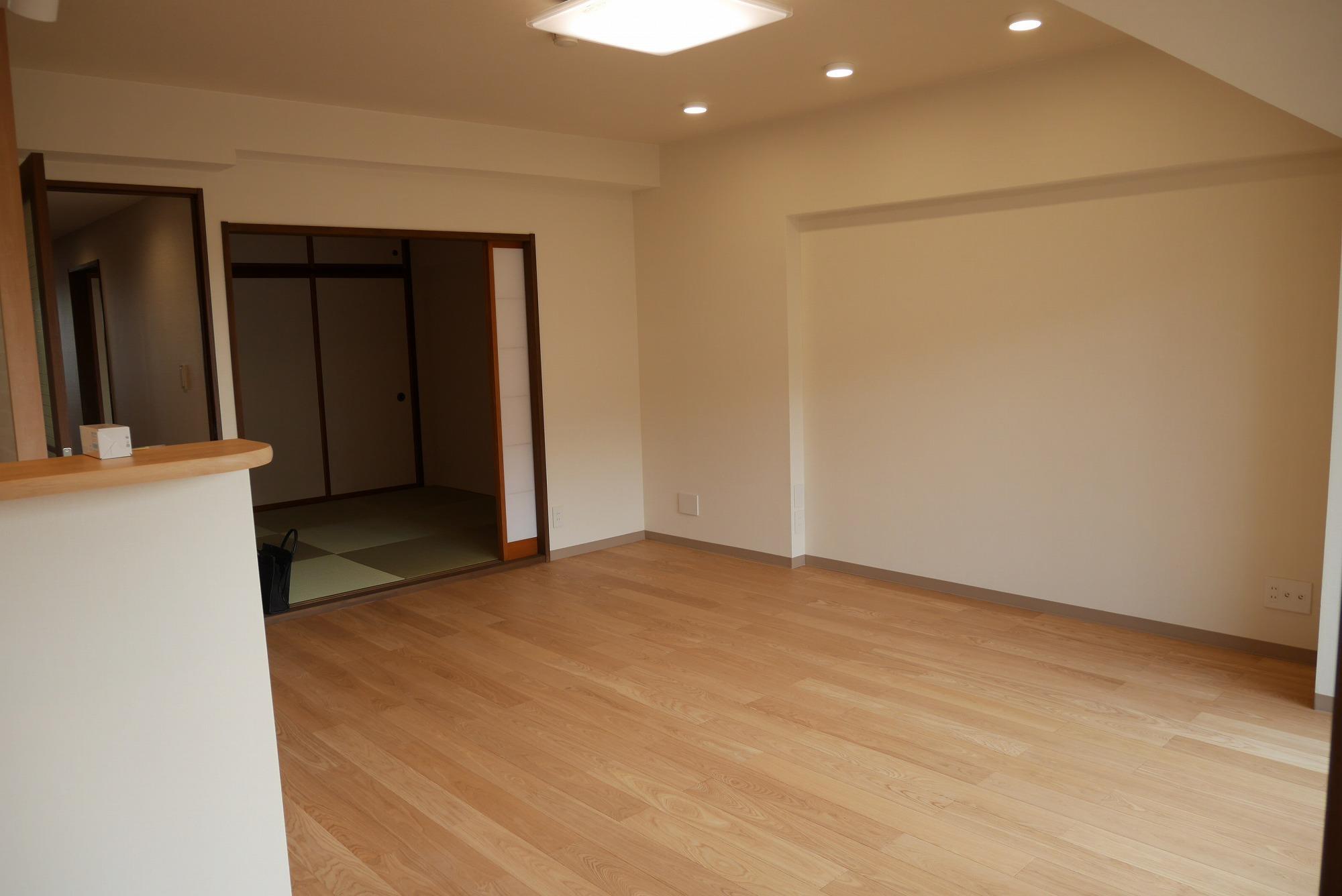 居間とキッチンの間の壁を取り去り、開放的に生まれ変わったLDK。