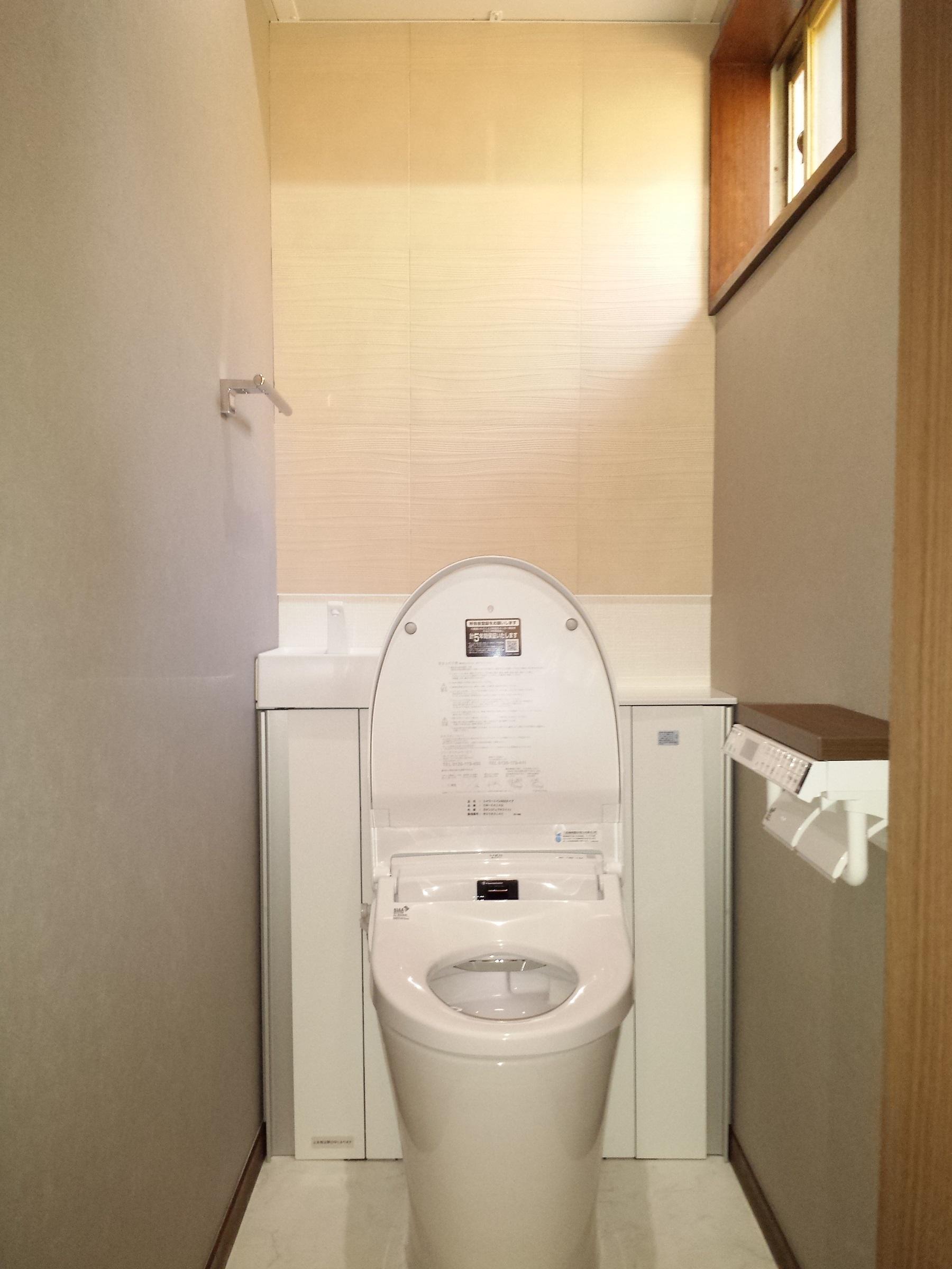トイレはキャビネット付のLIXILの「リフォレ」、 背面の壁には湿気やニオイも吸い取ってくれる「エコカラット」を設置しました。