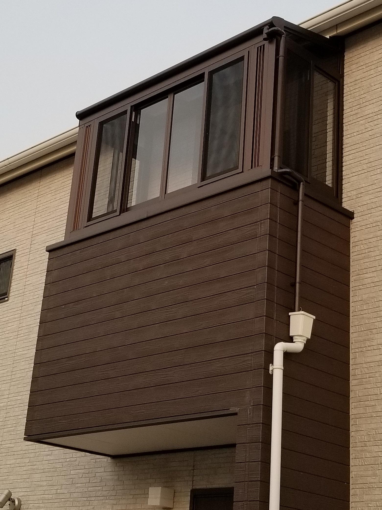 2階のベランダにバルコニー囲いを設置、外壁と同色で合わせおしゃれな空間になりました。 日当たりも良いので雨の日でも洗濯物が干せます。