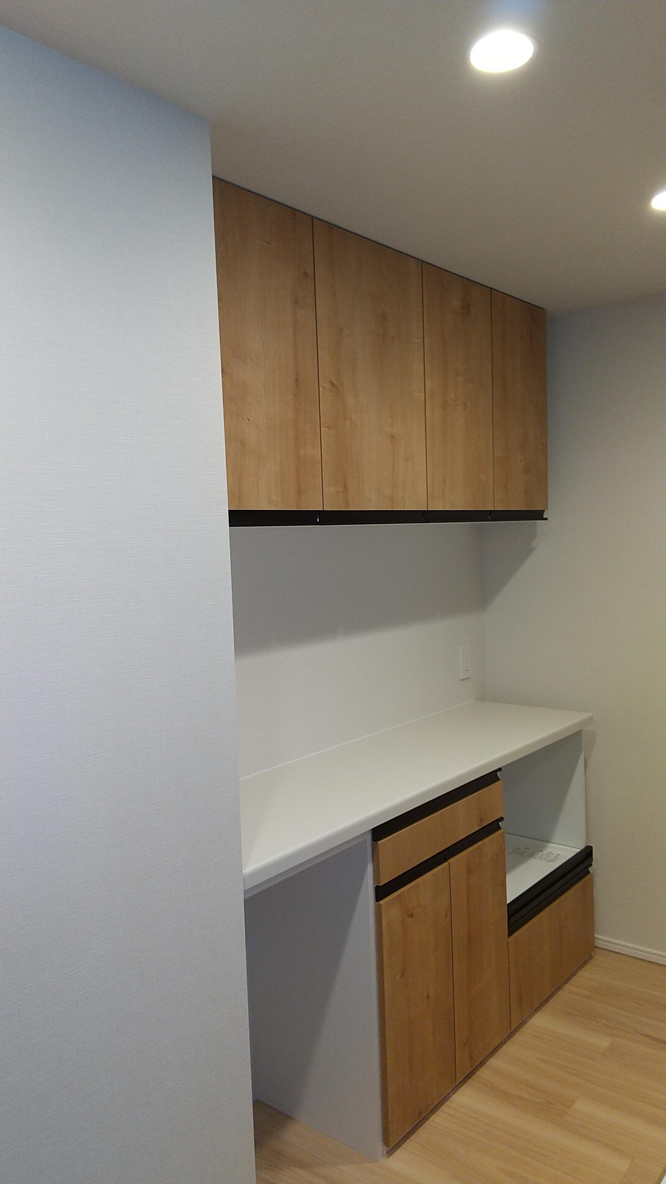 LIXIL「リシェルSI」のキッチン収納、幅1m60cmを設置。 右奥は炊飯器やポット等、左側はダストボックス等を 置く事ができます。