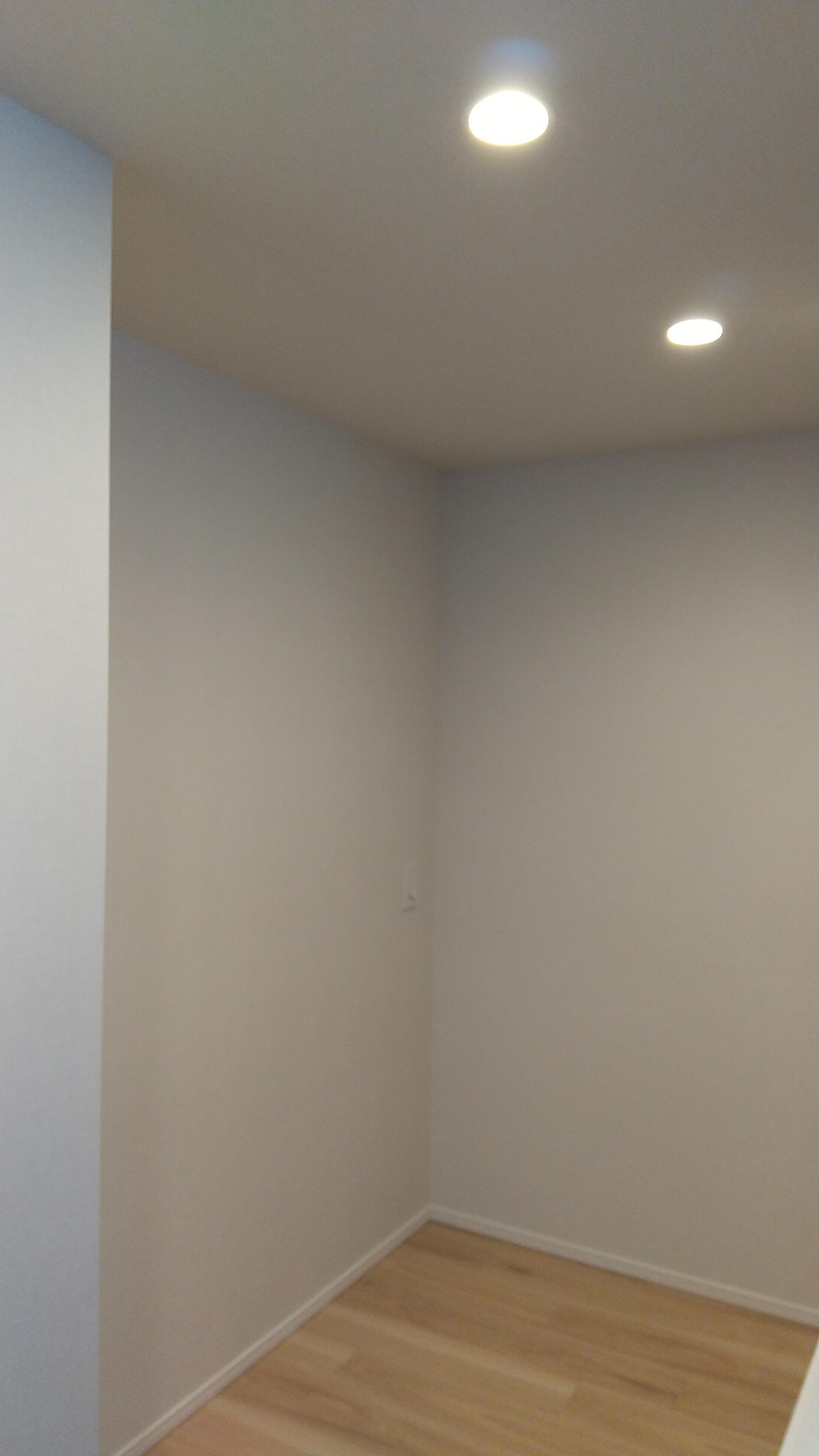 床とキッチンに近い色で収納扉の色を決めました。 扉の表情を引き締めるブラックの取手がポイントです。 開口部にぴったりと納まり、キッチン空間の一体感が高まりました。