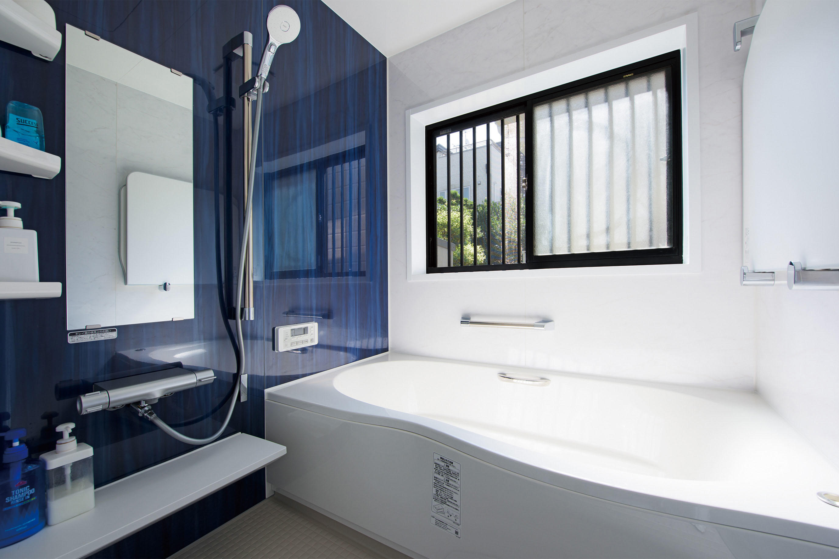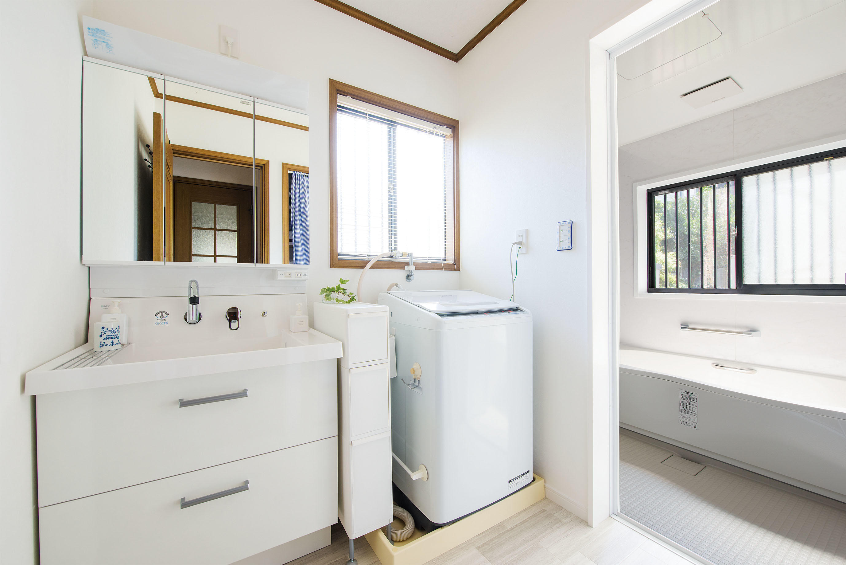 実際にショールームで商品をご覧いただき、各仕様を決めました。 手摺等はメタル調、壁三面はホワイトで、一面のみブルー色を入れ、 とても良いアクセントとなりました。 外廻りにもホワイト・ブルーで使われている箇所があり、 そちらと色を合わされたのかなと思っております。 洗面室も白を基調にまとめ、浴室と共に爽やかな空間となりました。