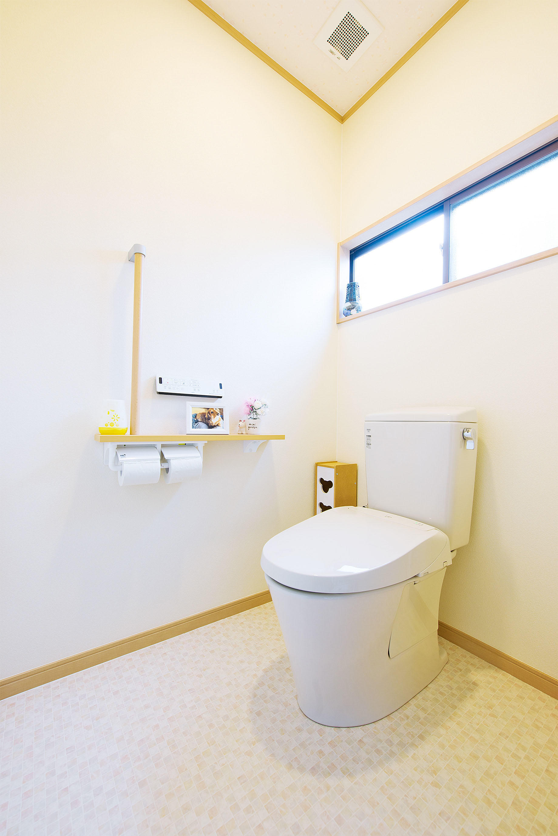 ドアを開けると明るい空間が広がりホッと落ち着ける場所になっています。 担当者のアドバイスで床を溝無しのクッションフロアにした事で、 拭き掃除が楽で衛生的です。手摺も付いて老後も安心です。 素敵なトイレにしていただき、家族が快適なトイレタイムを過ごせ、 1日をスッキリとスタートさせる事ができています。
