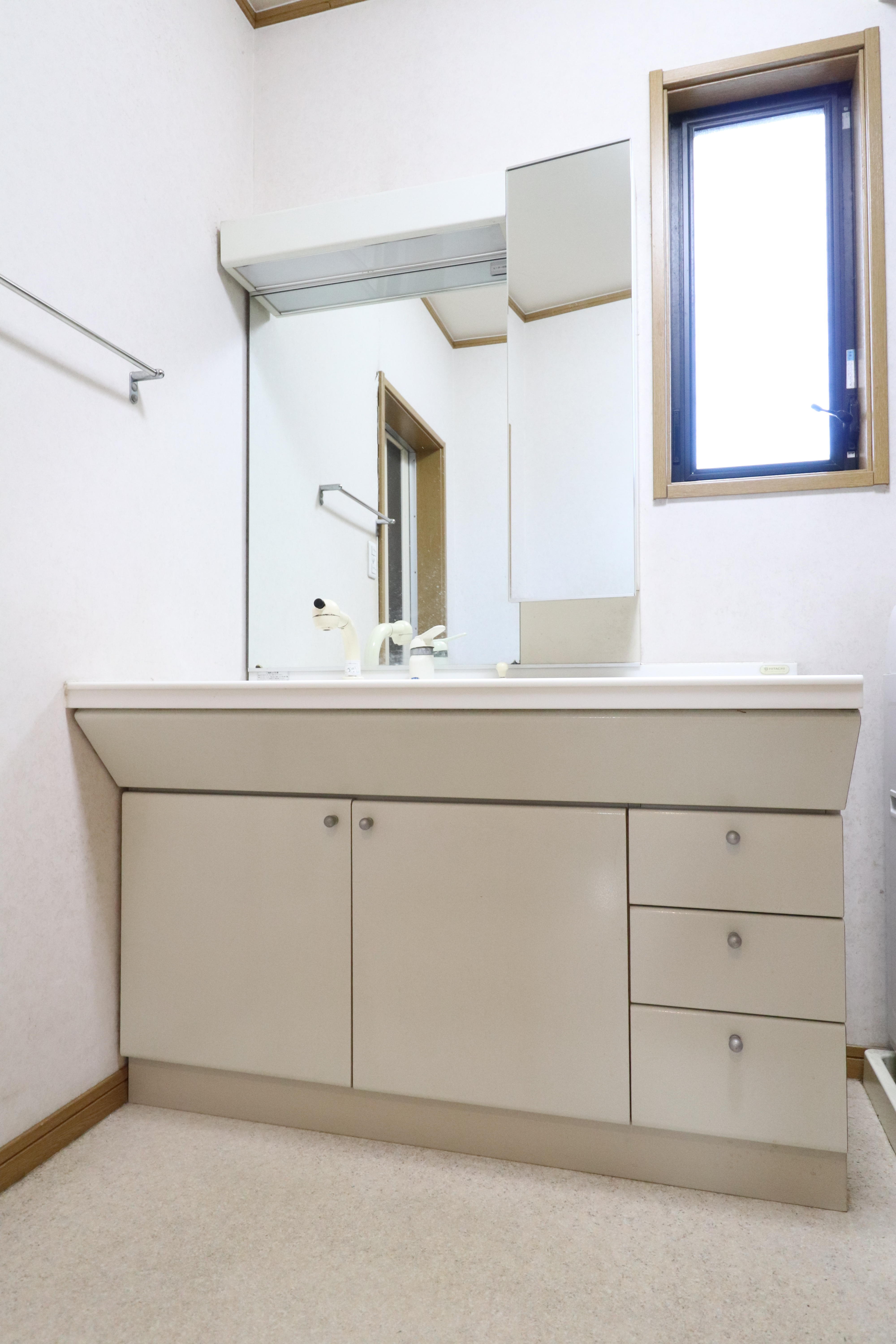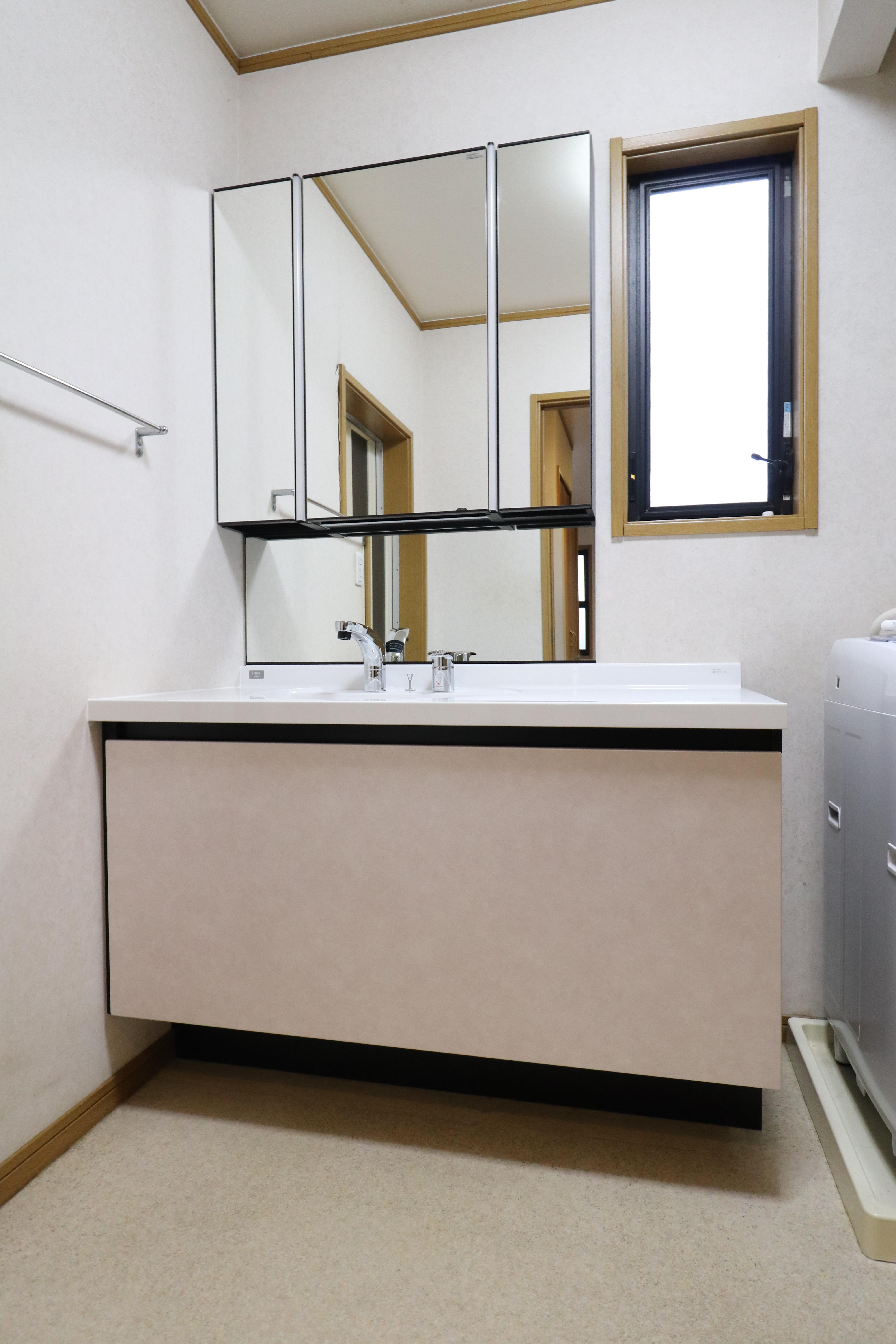 既存の洗面化粧台と同じ幅にしました。 窓がある為、鏡の幅は90cmです。 扉の色は優しい雰囲気のエクリュピンクを選定、床壁のクロスに 似合った色です。 ルミシスはホテルのような洗面空間をコンセプトに、 細部にまでこだわった洗面化粧台となっております。 照明はミラーの間に縦にLED照明が配置しており、顔全体に光が照らされて 影ができにくいように計算されております。