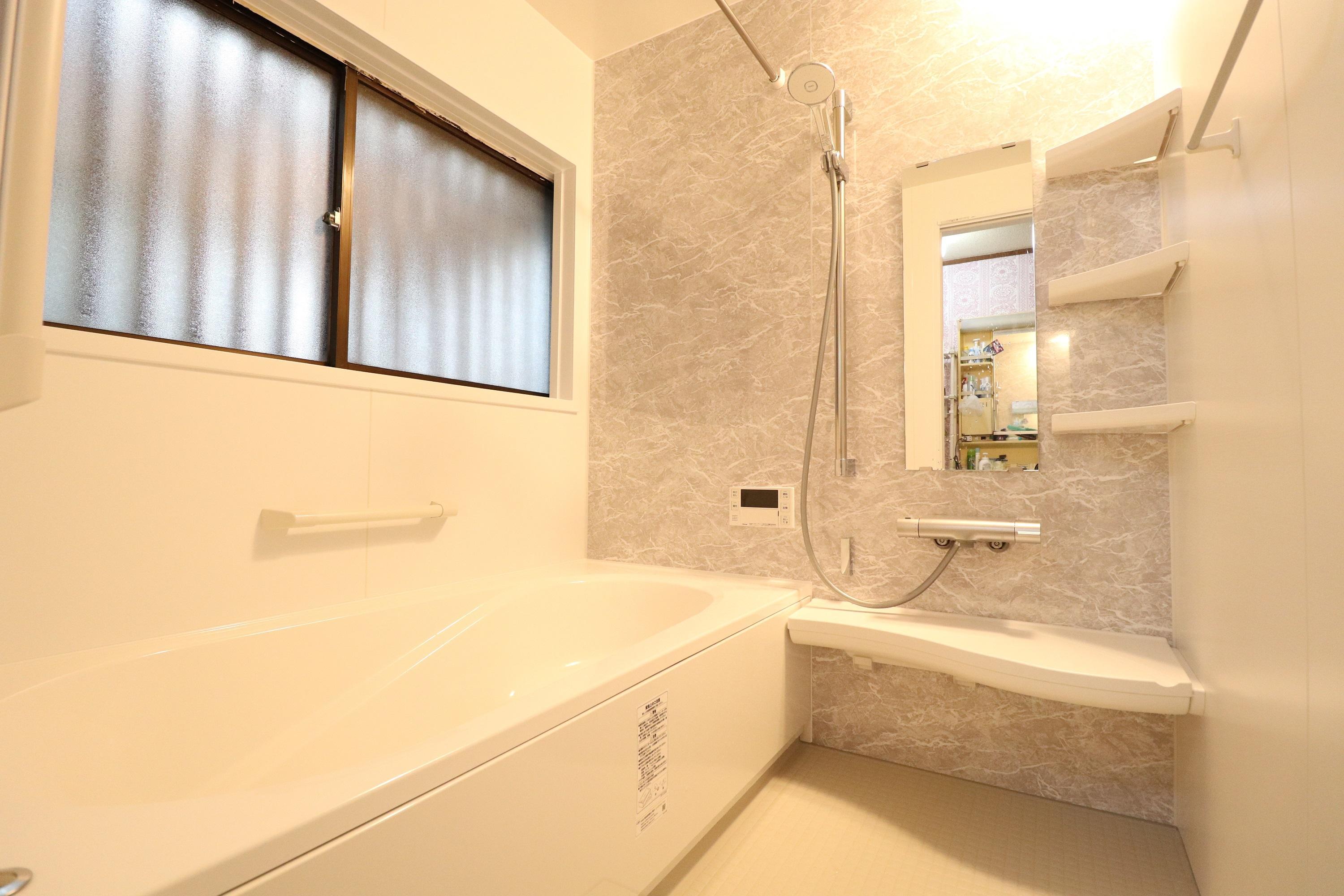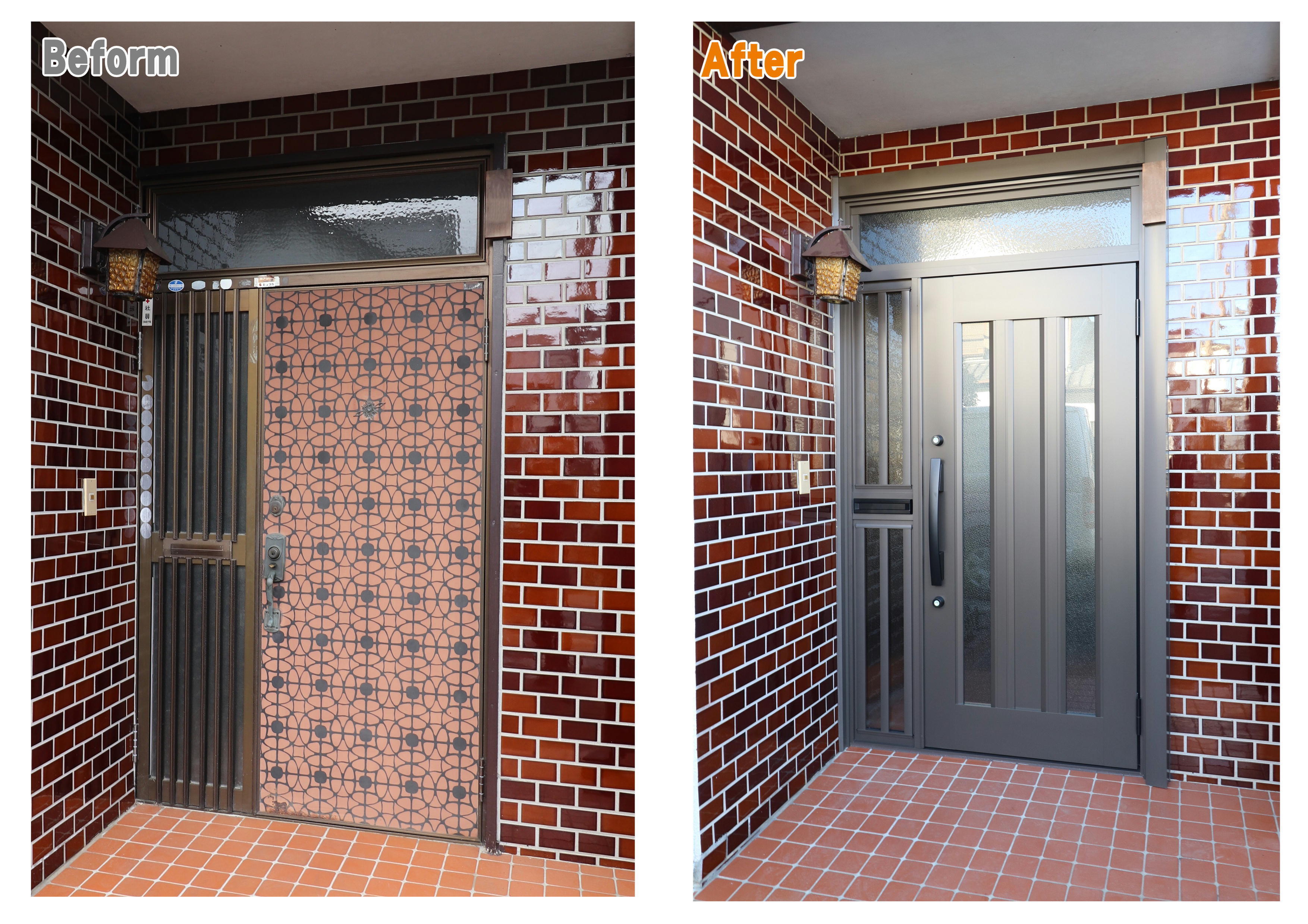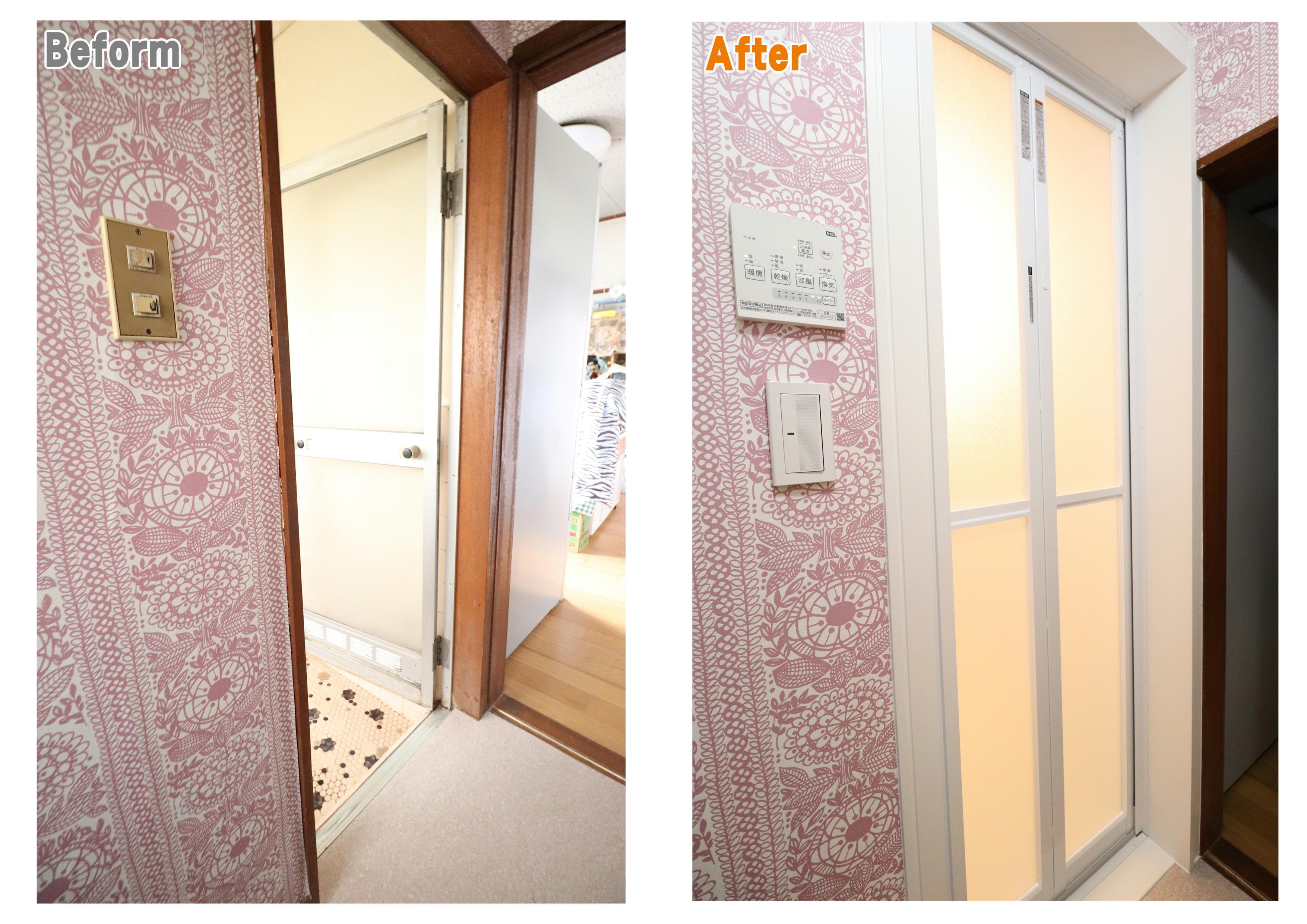 窓は既存のままで、新しい浴室となりました。ユニットバスは、LIXILアライズ(1坪)です。 冬の寒さも解消できるよう換気乾燥機を設置。 給湯器も外へ移動し、壁いっぱいの浴槽の広さとなりました。 実際にLIXILショールームで仕様をご確認いただき、鏡・水栓の付いている壁1面を グレー色の「グリジオセラドン」でアクセントを入れました。 玄関ドアは同じような形状の欄間・ポスト付をご希望でしたので、LIXILリシェントC16型をご提案。 鍵も破られにくい形状の為、防犯性も上がりました。