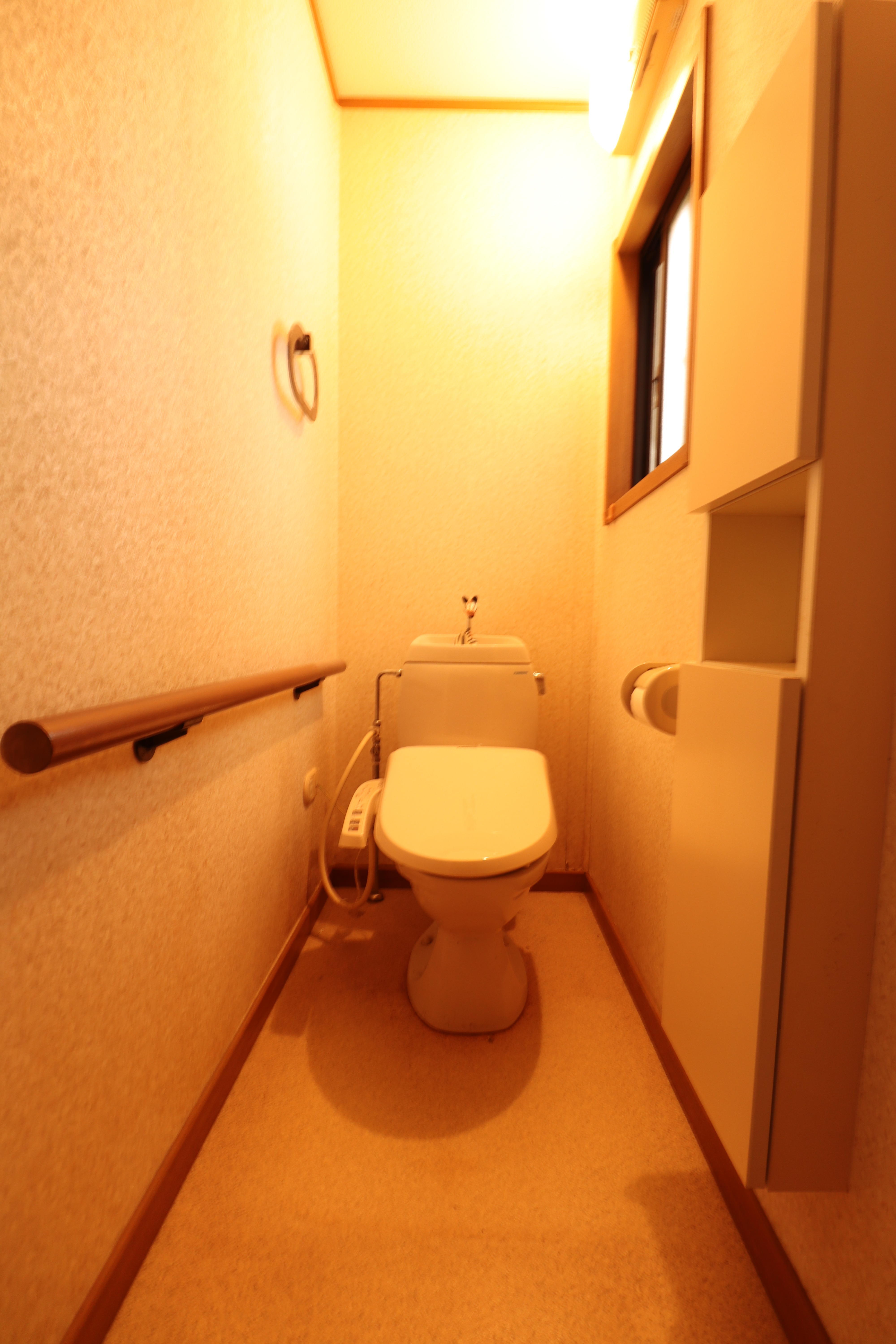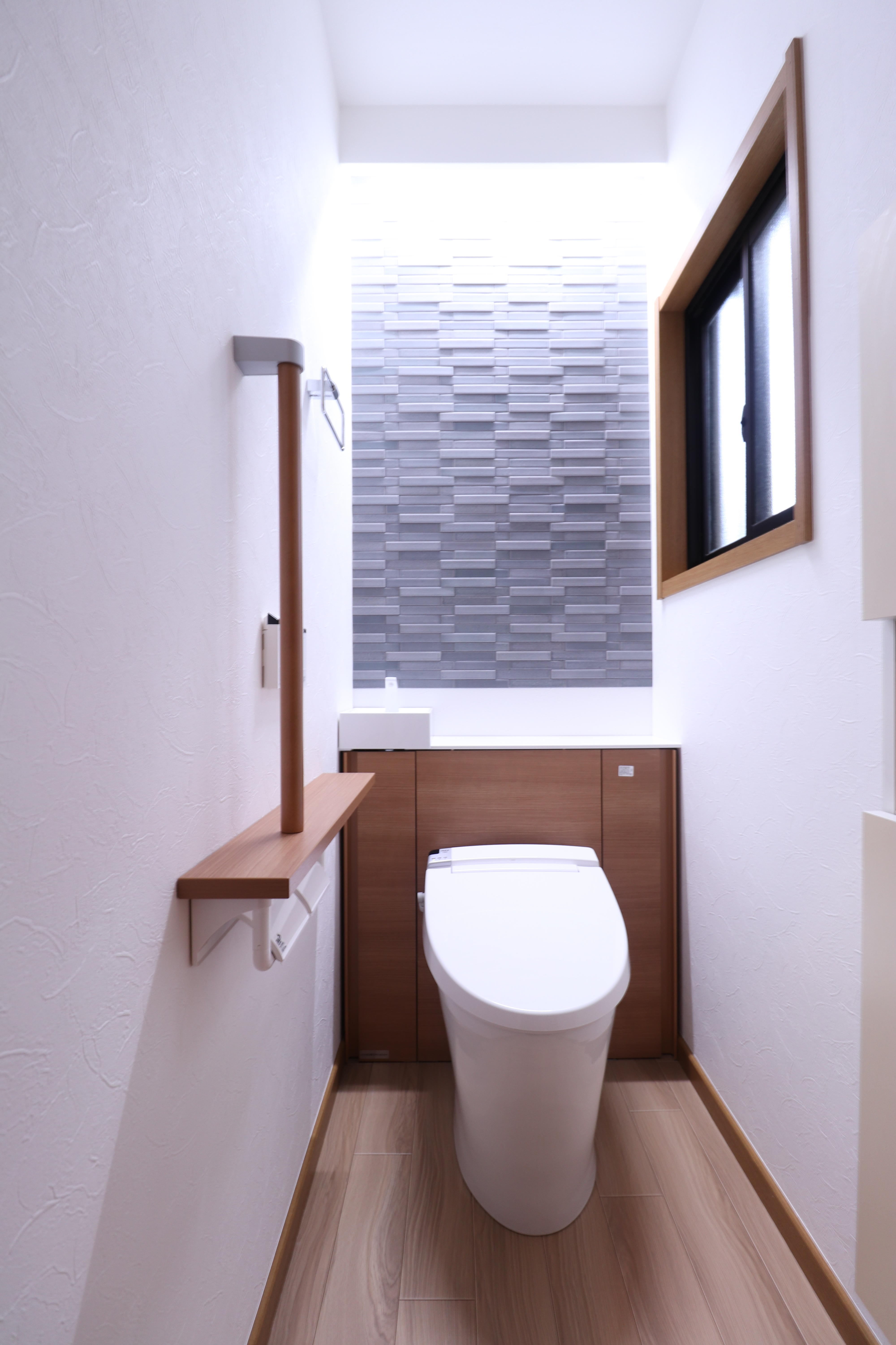 既存トイレは手摺の位置により中心から、少し右にずれていましたが、 床を剥がし排水の位置を中心に移動してトイレを設置。 キャビネットのクリエカラーに合わせて、手すりや床のクッションフロアも 選びバランスのとれた色合いとなりました。 壁一面には、エコカラットの新モデル「ノルディックカラー/フォグブルー」を アクセントに貼りました。表面は陶器のような質感、とても素敵でおすすめです。