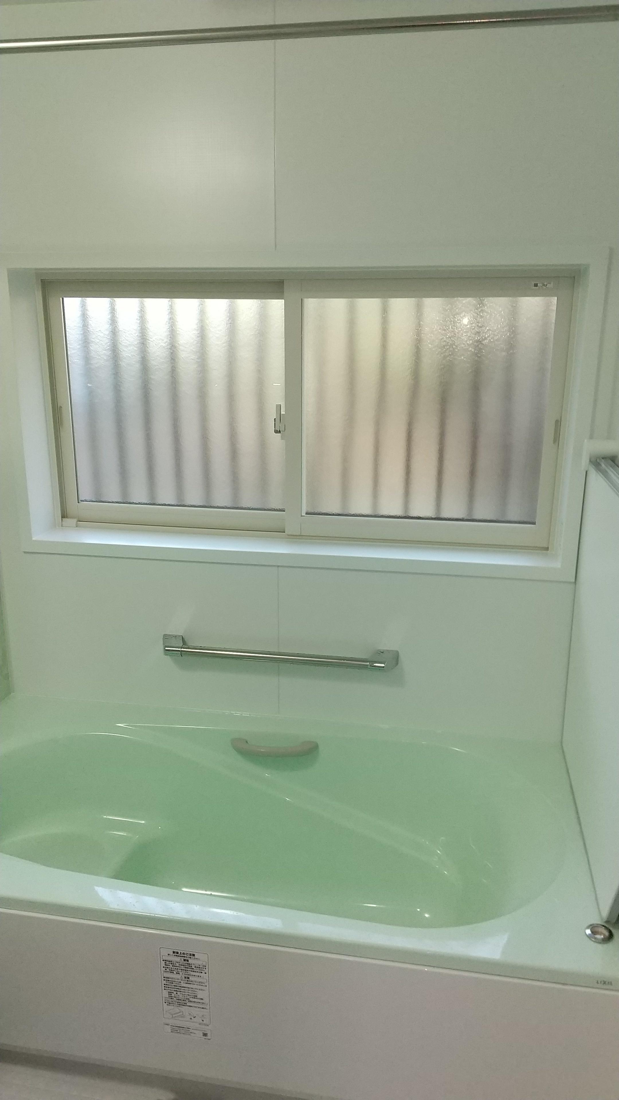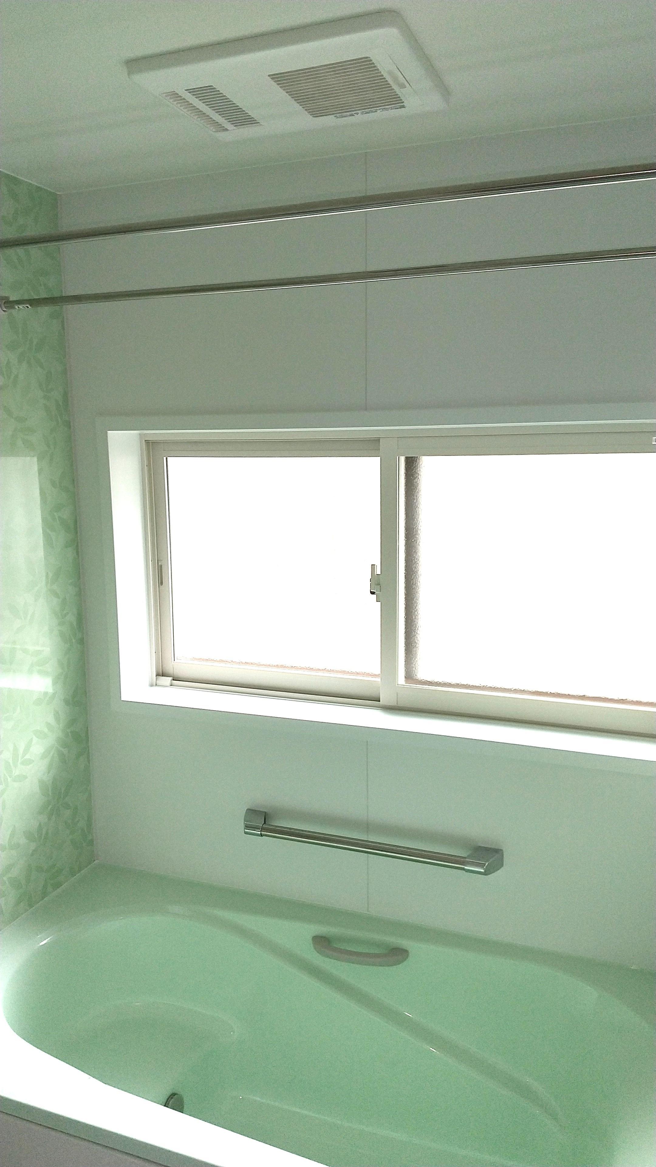 浴槽はお湯が冷めにくい、浴室保温材と保温組フタのダブル保温構造のアライズMタイプ。 壁パネルの色は森林の中にいるような爽やかなグリーンリーフ、浴槽もグリーンをお選びいただきました。 開放感のある大きな窓はインプラスに入れ替え寒い時期の入浴を暖かく楽しむことが出来ます。