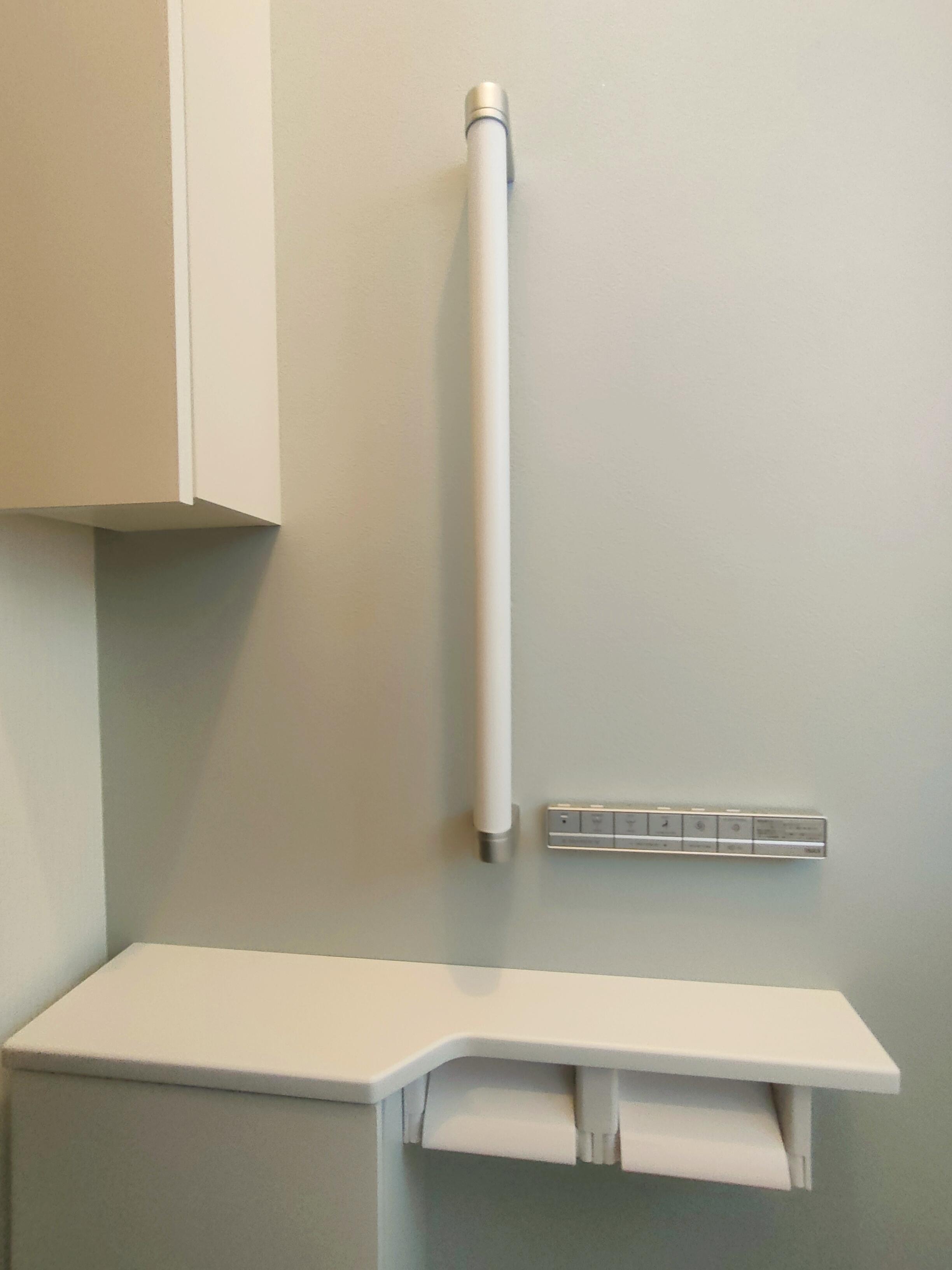 立ち座りサポートカウンター・紙巻器の棚は手をついて立ち座りができます。
