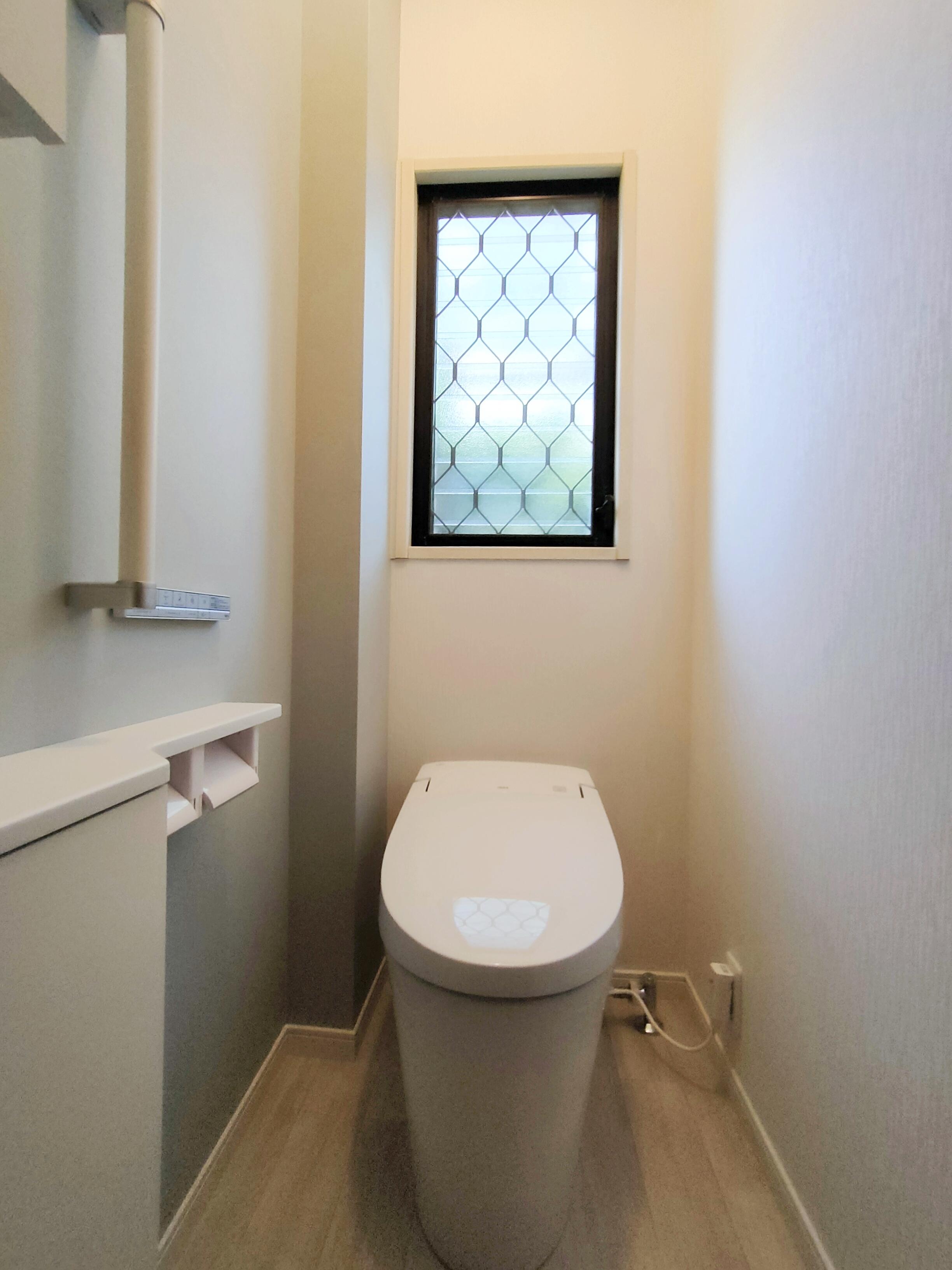 収納と手すりはTOTOのアメニティーをお選びいただきました。工夫された収納はトイレ空間をすっきりさせ使い勝手も向上します。