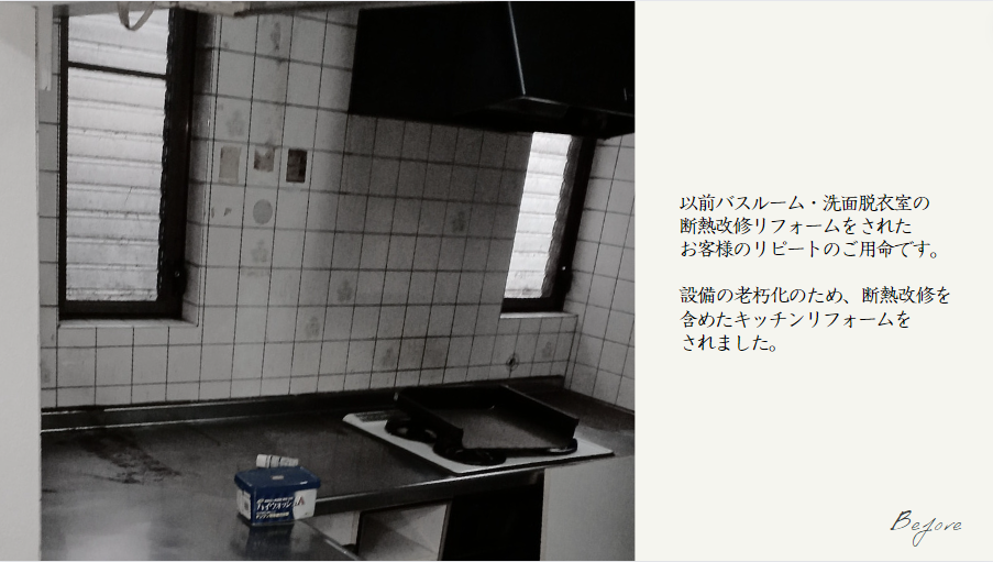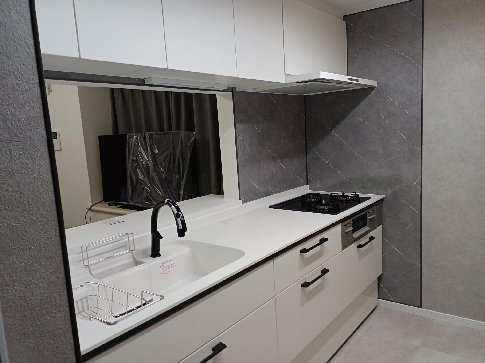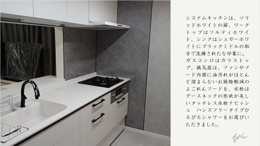 LIXILのシステムキッチン シエラSをご採用いただきました。 ソリッドホワイトの扉、ワークトップはソルティホワイト、シンクはシュガーホワイトにブラックミドルの取手をあわせ洗練されたな印象に。 ガスコンロはガラストップ、換気扇はファンやフード内部に油汚れがほとんど溜まらないお掃除軽減のよごれんフードを、水栓は多数のデザイン賞を受賞しているドイツのグローエ社製グースネックが美しいオールインワン水栓ミンタナビッシュ ハンズフリータイプひろびろシャワーをお選びいただきました。また、窓をなくすことにより断熱改修され快適なキッチンになりました。