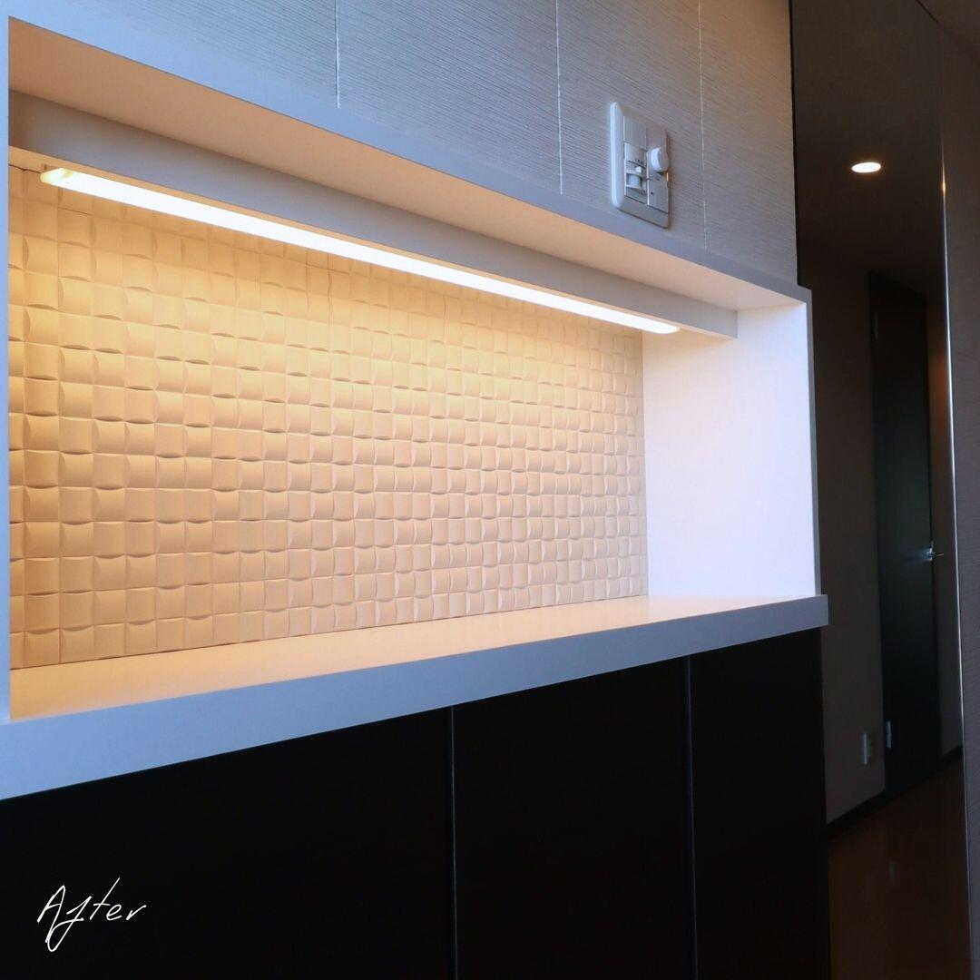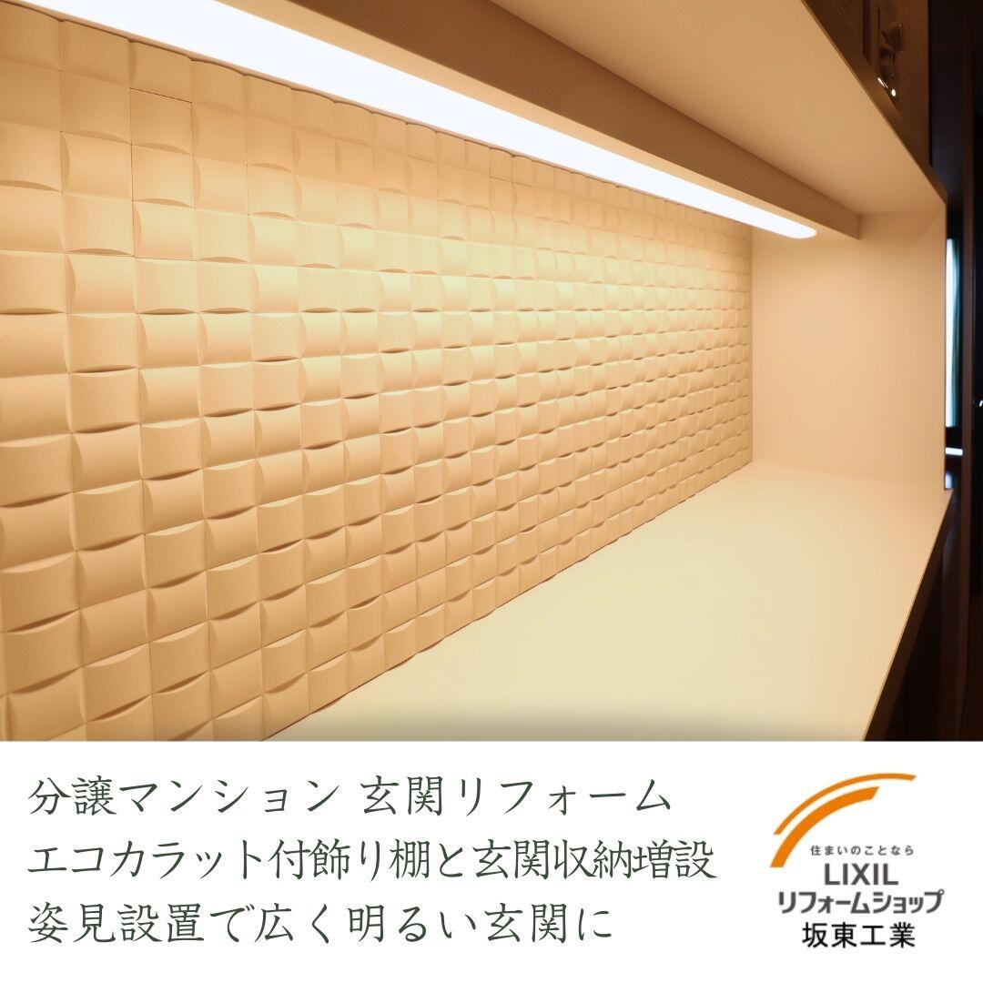 リピートのお客様です。 既に居室にエコカラットを設置されていらっしゃり、商品の良さを気に入られ、玄関リフォームにも取り入れられました。 タイプの違うエコカラットプラスをお選びいただき、入口に近い靴箱付き飾り棚には凸のデザインが美しい陰影を演出する ヴィーレのアイボリーで柔らかな印象でお客様をお出迎えできます。廊下の壁にはホワイトのたけひごで洗練された空間に仕上がりました。 玄関ドアの位置を変えられず、限られた空間で居室の日当たりを優先する分譲マンションの玄関は暗くなりがちです。 照明を増設されたり姿見を設置されると明るく広がりのある空間にすることが出来ます。 光を採り入れるガラスタイプの開口部ある室内ドアに交換されたり、室内窓のデコマドの設置もお勧めいたします。
