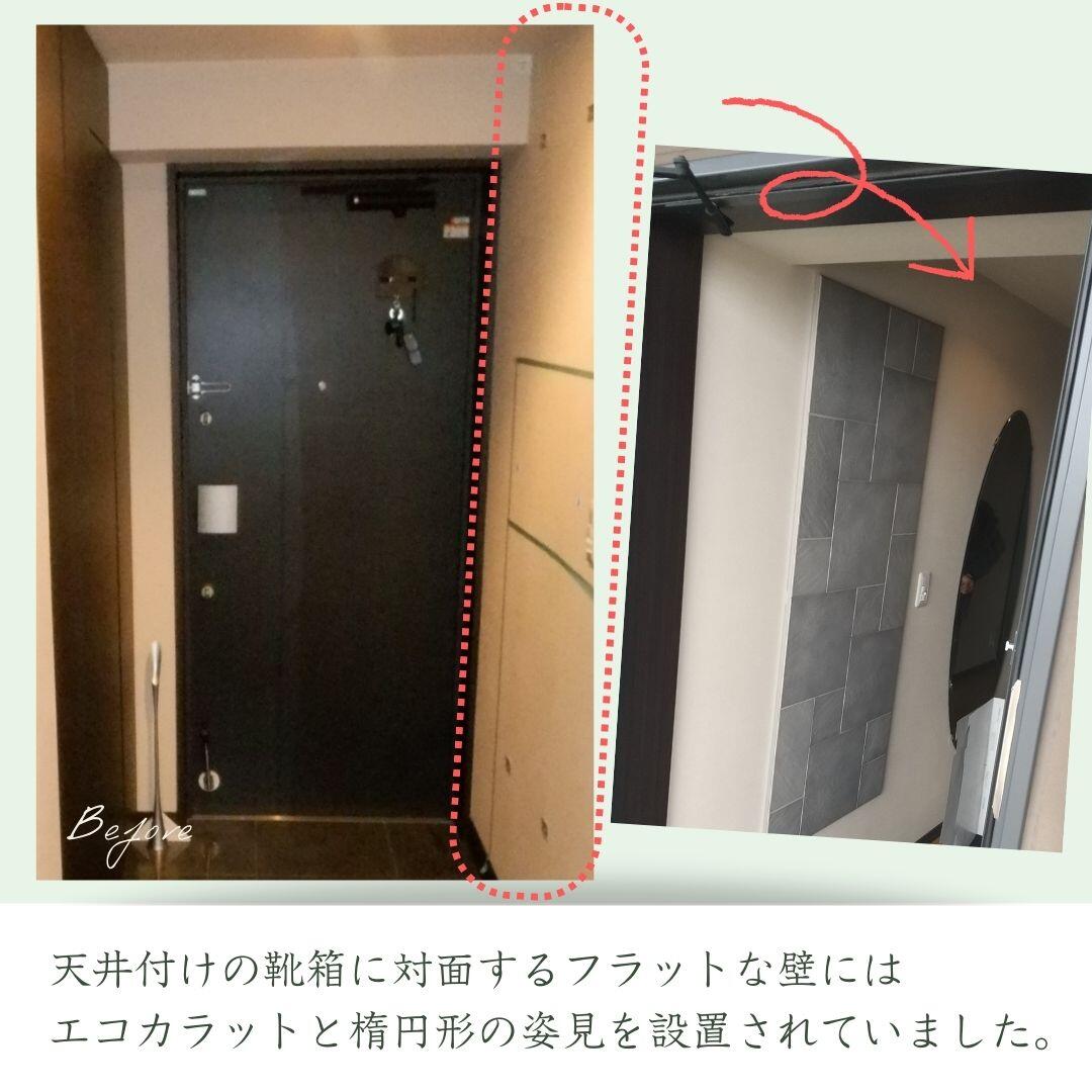 天井付けの靴箱に対面するフラットな壁にはエコカラットと楕円形の姿見を設置されていました。