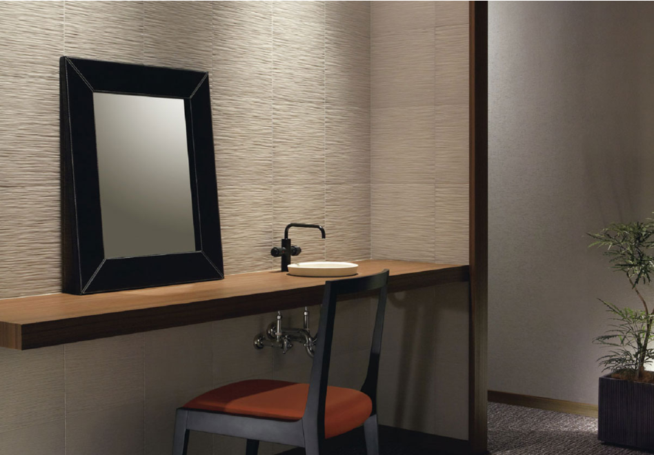 照明を設置した明るい飾り棚には丸みを帯びた凸のデザインが美しい陰影を演出するエコカラットプラス ヴィーレのアイボリーを。壁には和モダンな空間にマッチしたシリーズのたけひごよりホワイトをお選びいただきました。