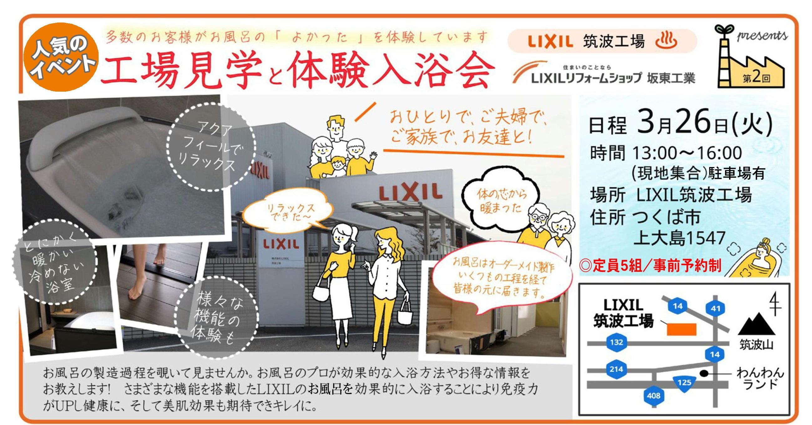 LIXILリフォームショップ 坂東工業 presents 第2回 " LIXIL筑波工場 工場見学と体験入浴会 " のお知らせ