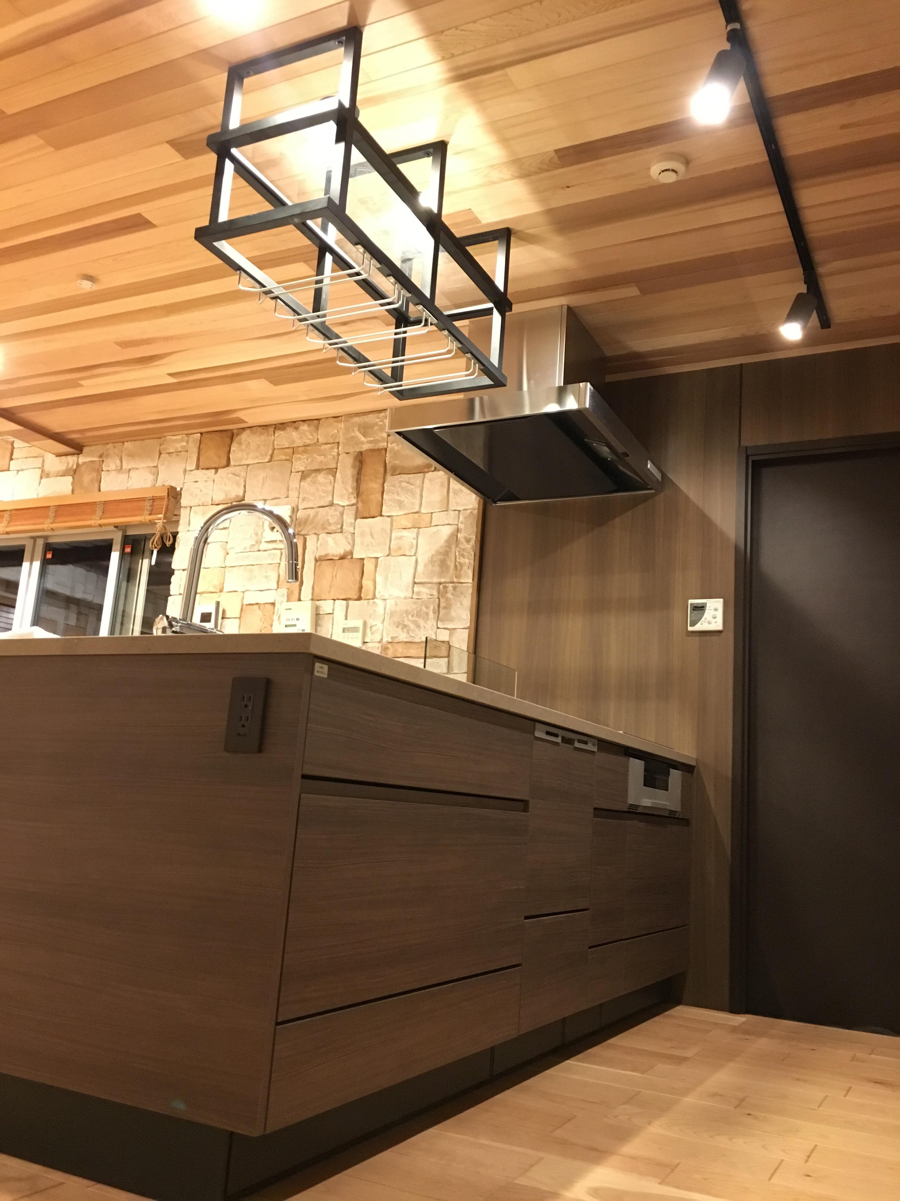 アイランド型キッチンも交換し、グラスハンガーも天井に設置しました。