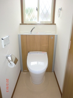 タンクが背面の手洗いキャビネットの中に隠れるタイプを使用しました。 トイレブラシや洗剤なども収納でき、便器の周りに隙間も無くなるのでとても掃除が楽になります。 壁や天井のクロス、床のシートも貼り換えてとても快適なトイレになりました。