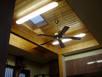 北側のダイニングキッチンを明るくしたいとのご希望で、天窓を新設しました。 通常の高さの天井を解体し梁補強、タルキ構造に変更して無垢板貼りで仕上げました。 明るく開放的な空間に生まれ変わって大変お喜びいただきました。