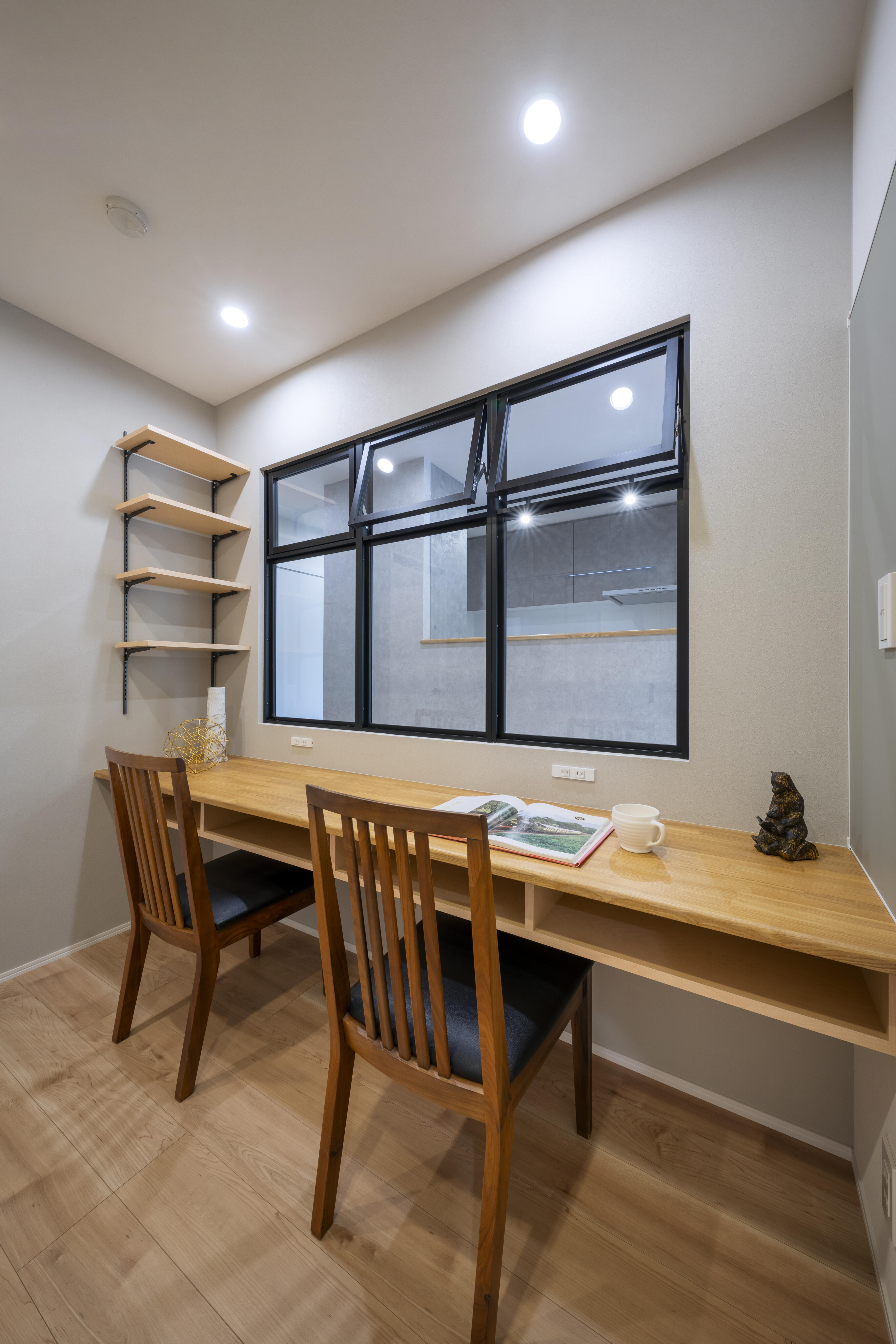 室内マドを設けたスタディルームを配置し、キッチンで作業しながら また リビングからも、子供たちの様子が分かるようになりました。