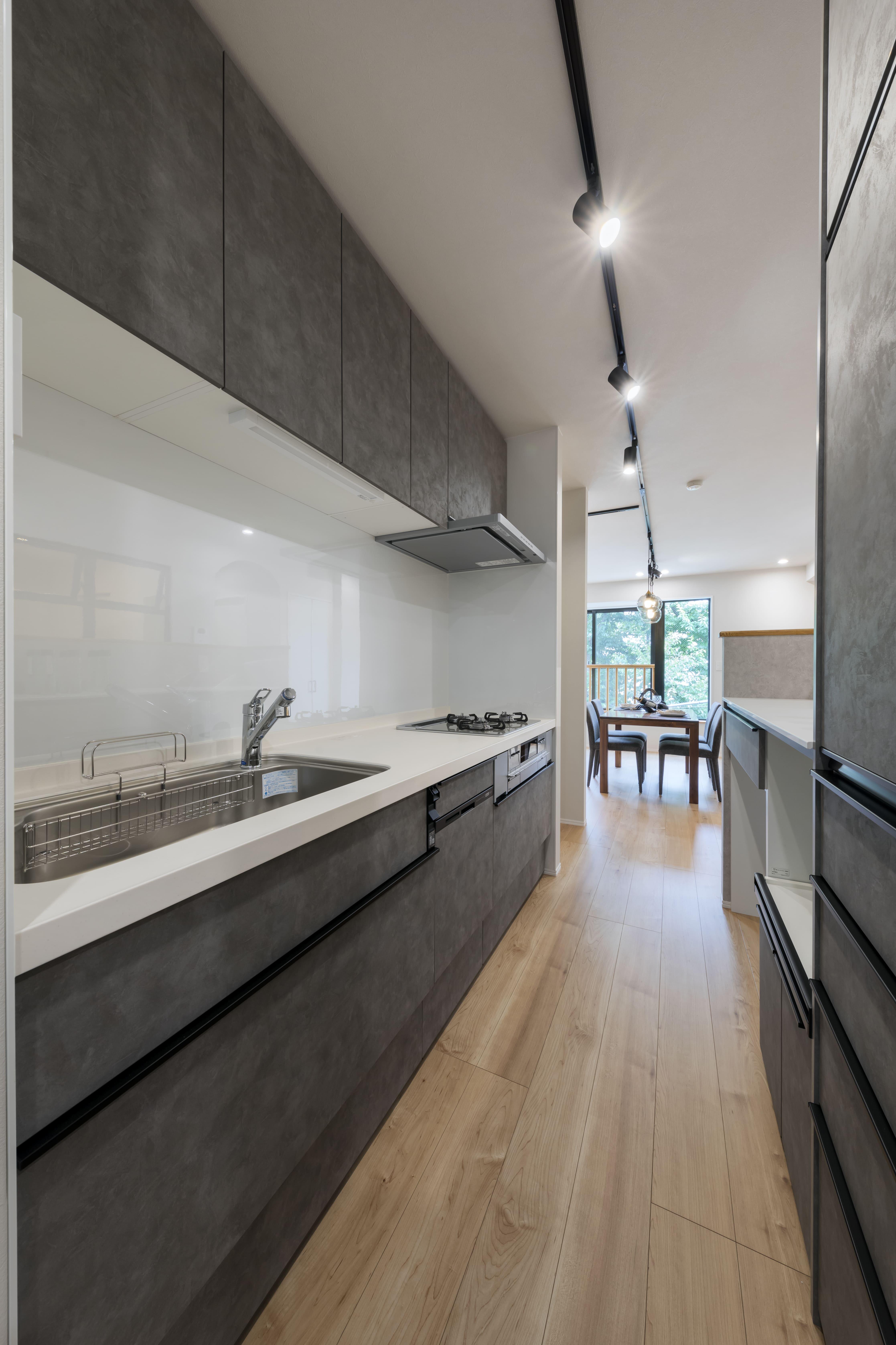 キッチン家電等の背面を隠したいとのご要望から、カウンターの立上りを高めに設定し、スッキリと見せながらも視界は遮らないデザインに。