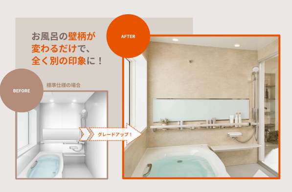 今回のキャンペーンでは、浴室の壁パネルをワンランク上のデザインへ3万円OFF(メーカー希望小売価格より)でグレードアップが可能!