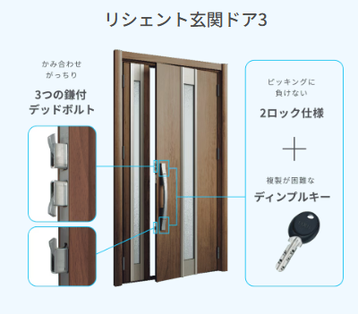 LIXILのリフォームドア「リシェント」は2ロックを標準装備し、シリンダー自体も不正解錠しづらい構造です。